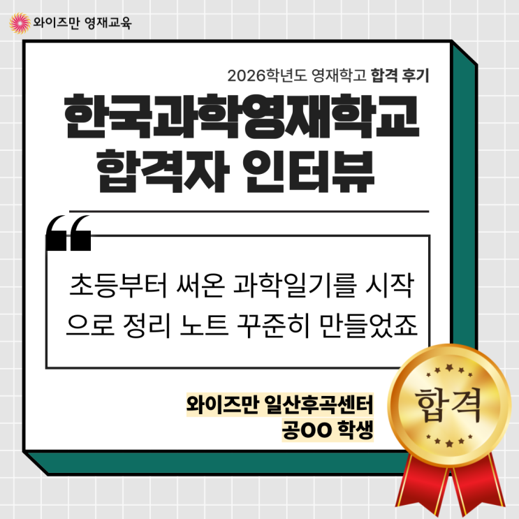 영재원 친구들과 함께 참가했던 한국과학영재학교 과학축전 KSASF. 연구 결과를 직접 발표하고, 수상자 명단에 이름을 올렸던 그날. 다양한 학생들의 탐구 결과를 보며 한과영의 분위기를 몸소 느꼈던 그 경험은, 오늘의 주인공에게 특별한 기억이 되었습니다. 한국중학생과학올림피아드(KJSO), 한국중학생화학대회(KChO), 물리대회(TPL)까지. 중등 과학 분야의 주요 대회를 차례로 섭렵하며 금상, 대상, 국가대표 선발이라는 의미 있는 성과를 이어온 공OO학생이 바로 그 주인공입니다. 이번 와이즈만 영재학교 합격스토리는 2026학년도 한국과학영재학교 우선선발 합격, 와이즈만 일산후곡센터 공OO 학생의 이야기입니다. '리튬'이라....... <img src="https://blogthumb.pstatic.net/MjAyNjAzMDNfMTM3/MDAxNzcyNTMyNjI2OTky.mLzb70O2Q7QdYrqljFN29tAagCHaDLlfJyOHpPZFE6Ug.b1bqyNxAMCe6S7rtChW2JWqCcBraw4SuZPiJ47ECQiIg.PNG/%C7%D5%B0%DD%BB%FD-%C8%C4%B1%E2_%B0%E6%B1%E2%B0%FA%C7%D0%B0%ED%B5%EE%C7%D0%B1%B3-004.png?type=s3" />