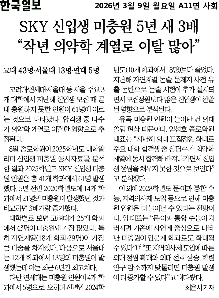 오늘부터는 일~금요일까지 ISSUE가 되었던 기사만을 추려 일주일에 1회씩 뉴스를 올리겠습니다. 각 신문사별로 비슷한 내용의 기사가 많고, 실질적인 교육과 관련성이 없는 기사들도 많아 억지 포스팅의 느낌이 있기에, 알짜 뉴스만 종합하여 정보를 전달해 드리도록 하겠습니다. 그럼 오늘의 포스팅을 시작하겠습니다.(포스팅 성격 상 존대가 아닌 점 양해~^^) 최근 교육 흐름은 크게 세 가지 축으로 움직이고 있다. 첫째, AI·첨단기술 중심 교육 확대, 둘째, 의대 쏠림 현상과 입시 구조 변화, 셋째, 논술·탐구·교과 등 대학 평가 방식의 다변화다. 특히 AI교육 확대와 메디컬 쏠림, 논술 확대 등은 학생들의 학습 방향과 입시 전략 자체를 바....... <img src="https://blogthumb.pstatic.net/MjAyNjAzMTNfNjcg/MDAxNzczMzYyODI4ODA1.JTpLhGIYn4RGec4kDhp2dJmBKR7CfvLVvBIZGsGOz-gg.XCibYAvoJ0qLm2G2RJqkuLppIwqwE-yTipK-EbFyXPog.PNG/KakaoTalk_20260309_072215315_08.png?type=s3" />