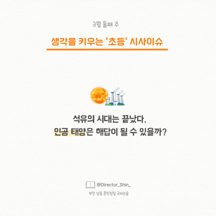 흥미로운 이야기에 몰입하는 순간, '독해력'은 자연스럽게 따라옵니다 안녕하세요 흥미로운 탐구 주제와 읽기 자료를 매주 공유하는 부천 상동ㅣ훈민정필 국어논술 신원장입니다. 아이들의 문해력 성장에 관심 많으신 학부모님들을 위해 도움 되는 자료를 아낌없이 나누고 있으니, 관심 있게 지켜봐 주세요.✨ < 다운 링크 > 글 아래쪽에 학부모님들을 위한 이번 주 주제 요약을 담았으니, 끝까지 정독 부탁드려요! 그리고 아이와 함께 자료를 읽고 사고력을 키워주는 핵심 정리, 집에서 꼭 실천해 보세요! 이번주 주제 석유의 시대는 끝났다, 인공태양은 해답이 될 수 있을까? 1. 흔들리는 에너지 안보, '기....... <img src="https://blogthumb.pstatic.net/MjAyNjAzMTdfMjAy/MDAxNzczNzMxNTYwNTcw.DBG1CBWUZ0jOr69FaCl5fbQx-9sOfDL6A_FO9bKT-Wcg.QQx5FT0z-1xIKhhQcrqKO4NiRsK0QJ2SX18lTd15u-sg.PNG/%C3%CA%B5%EE-%C0%CE%BD%BA%C5%B8-001_%282%29.png?type=s3" />