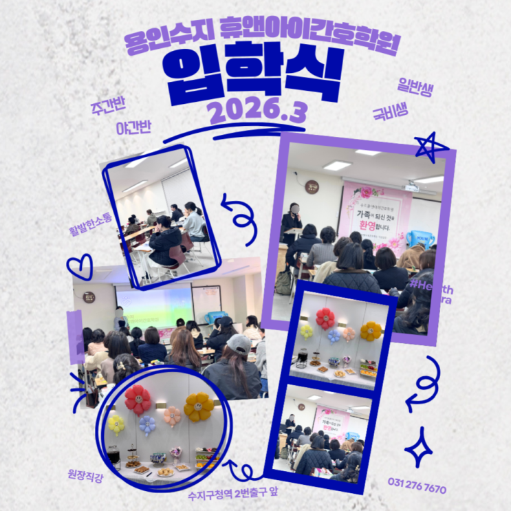 안녕하세요~ 2026년 3월! 벌써 2026년도 1/4 지점입니다 모두 새해에 세우셨던 목표는 잘 진행중이신가요~? 저희 수지 휴앤아이간호학원은 2026년의 첫 개강인 3월 개강을 잘 진행시키는것이 목표 중 하나였어요 간호학원은 보통 3월과 9월에 개강하기 때문에 3월 첫 입학이 인기가 아주 많습니다 (새해 새로운 마음으로 새로 시작하시는 분들이 많으세요) 언제나 인기 100점 아니 1,000점 아니 10,000점인 수지휴앤아이간호학원의 3월 개강반 입학식을 잘 진행하였습니다 수지휴앤아이는 용인시 수지구에서 13년동안 간호조무사를 양성하고 배출하며 학생분들에게 다양한 배움과 취업의 길을 열어드리려고 많은 노력을 하였는데요 이렇게 입학이....... <img src="https://blogthumb.pstatic.net/MjAyNjAzMThfMjIz/MDAxNzczODE5MzYzMzk2.ZwZ6BvKclF0f6v0ZIqQdruVaW3lsFH0UwXf7QixY6GUg.iN58fcRDtT5oOSnoPKJwlIsDJfyZT99-iTOGjxC0lVog.PNG/D%BF%EB%C0%CE%BC%F6%C1%F6_%C8%DE%BE%D8%BE%C6%C0%CC%B0%A3%C8%A3%C7%D0%BF%F8.png?type=s3" />