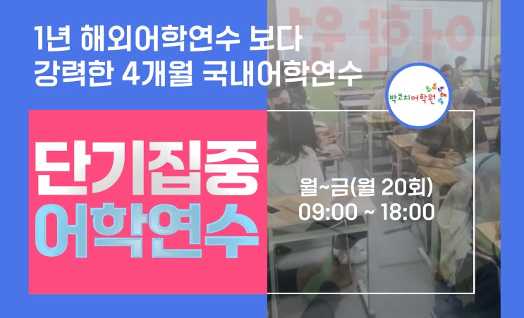 안녕하세요. 3월도 어느덧 중반에 이르렀네요. 오늘은 박코치어학원 과정을 간단하게 소개해 드리겠습니다. 4개월이면 수강생 모두 하고싶은말 영어로 다 말하게 된다는데... 도대체 어떤 교육 과정이 있길래 그런걸까요^^?? 올인원패키지 스파르타스피킹 단기집중어학연수 박코치어학원의 단기집중국내어학연수!! 해외어학연수 2배↑효과 연수비용 2배↓Down 효과 수많은 학생들이 어학연수 대신 박코치어학원을 선택하는데는 다 이유가 있습니다. 열정이 넘치는 코치 선생님들과 꿈을 향해 달려가볼까요? 감사합니다. <img src="https://blogthumb.pstatic.net/MjAyNjAzMTRfMTE3/MDAxNzczNDUxMzIzMDEw.lYaoKtwqQNdM_dkRwQFkXa_0AuUfsnsb-YDrG9_7fKgg.wJZYwYI0zsrKkwDn536RkwYIX4ZtIqCGhY7B529weO0g.JPEG/%B0%AD%B3%B2%BF%B5%BE%EE%C7%D0%BF%F83.jpg?type=s3" />
