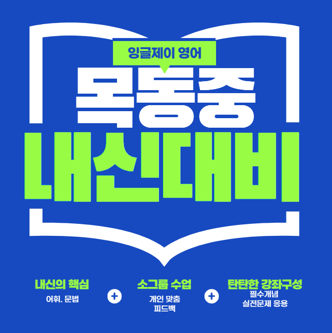 4월 목동중 내신대비 목동중 내신 집중반을 개강합니다 목동중학교의 내신 유형을 분석하고 응용하여 학생들의 실제 시험 점수향상에 도움이 되어 왔습니다 이번 2026학년도 목동중 내신 대비를 잉글제이 영어 교습소에서 준비하세요 <목동 잉글제이 영어 교습소 내신반 강점> 개별 피드백이 정확하고 꼼꼼하다 단순 암기가 아닌 이해력을 쌓은 후 암기한다 영영 뜻풀이 단어 암기 완벽할 때까지 반복한다 문법 유형을 정확히 간파하고 개념부터 실전 문제까지 지도한다 목동중 영어 내신 100점 가능합니다 노력하는 학생과 관리하는 지도자의 시너지를 믿고 많은 문의 부탁드립니다 내신대비 일정 4월 월. 금 6시 - 8시 30분 : 목동중 2학....... <img src="https://blogthumb.pstatic.net/MjAyNjAzMDhfOTEg/MDAxNzcyOTQ1OTkzNzkz.xD9D7pGUuGAg855aRur7xfTqFnZKj_P5XqtnC7V0xjgg.3TAK4svpcmvqgwdFpXFWUYrnj1jArU_nAOaTz0cnqyog.PNG/image.png?type=s3" />