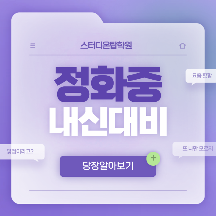 안녕하세요. 스터디온탑학원입니다. 시험이 다가오면 학생들도, 부모님들도 이런 이야기를 많이 합니다. “문제집은 열심히 풀었는데 시험이 생각보다 어렵네요.” “분명 공부했는데 시험에서 처음 보는 느낌이에요.” 사실 많은 경우 공부량의 문제가 아니라 시험 방식의 문제인 경우가 많습니다. 특히 정화중학교 시험은 교과서 이해, 외부 지문 활용, 서술형 평가 함께 출제되는 구조이기 때문에 단순 문제풀이만으로는 대비가 쉽지 않습니다. 그래서 중요한 것은 학교 시험의 출제 특징을 정확히 이해하고 그에 맞게 준비하는 것입니다. 오늘은 정화중 시험의 과목별 출제 특징과 대비 전략을 정리해보겠습니다. ✔과목별 출제 특징 및 대비....... <img src="https://blogthumb.pstatic.net/MjAyNjAzMTJfMTY0/MDAxNzczMzA1OTgzNDM1.X2mHcRSsgMBRXRwyenT28IRQ89f2TtGzWkyUqXxQ628g.fp3WId-S3lsXes83ts0yhpmFPgsW6dss__r5sYVxly0g.PNG/1.png?type=s3" />