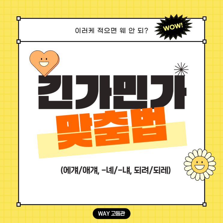 안녕하세요~ WAY 고등관입니다! 오늘도 흥미로운 맞춤법의 세계로 빠져볼까요~? 그럼 시작! 스크롤을 내리면서 알맞은 답을 골라보세요! 구어체에서 많이 쓰는 표현이고 표기를 하는 경우가 드물어 더욱 헷갈리는 단어인데요..! 에걔와 애걔 중 바른 것은? 정답은 바로~~ '애걔'가 맞습니다! '뉘우치거나 탄식할 때 아주 가볍게 내는 소리' 또는 '대단하지 아니한 것을 보고 업신여기어 내는 소리' 라는 의미의 감탄사로 사용되는 단어이지요. '에걔'가 틀리고 '애걔'가 맞는 이유를 설명할 수는 없습니다. 그냥 그렇게 정해져 있는 거라서요^^.. 대신 맞는 표현과 틀린 표현을 정확하게 정리....... <img src="https://blogthumb.pstatic.net/MjAyNjAzMTdfMTU2/MDAxNzczNzMwNzgxMzAy.xdpXlIrAaabLIZfVKlWXoJ-lqSShkXpZ8j0IXtsm1Kgg.RVqf5j6W0v3Dls9VbSZapB8lYuuyA79sqN1FMvX7rNsg.PNG/%C1%A6%B8%F1%C0%BB_%C0%D4%B7%C2%C7%D8%C1%D6%BC%BC%BF%E4_-001.png?type=s3" />