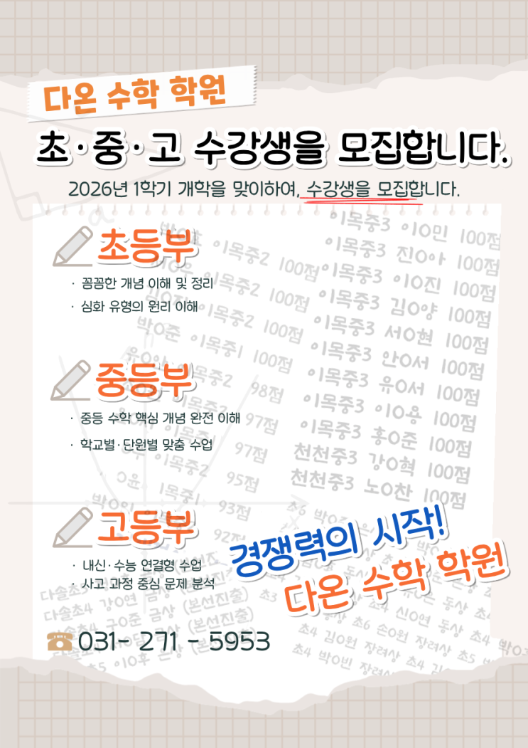 안녕하세요! 새 학기를 맞이하여 다온 수학 수강생을 모집합니다! 저희는 꼼꼼히 수학의 내실을 다지는 학원입니다. 수학은 머리 속에 무언가를 채워 넣는 과정이 아니라 아는 것들을 조합시키고 응용하는 과정입니다. 저희는 이러한 과정을 '사고력' 이라고 부릅니다. 이러한 수리 사고력을 향상시키기 위해선 다음과 같은 2가지가 필요합니다. 흥미, 끈기 저희는 무작정 진도를 나가기 보다는 사고력을 기르기 위해 내실 있게 꼼꼼히 케어하며 수업이 진행됩니다. 특히 흥미를 잃지 않으며 끈기를 기르는 교육 철학을 가지고 학생들 한 명 한 명 꼼꼼히 만들어 나갑니다. 이러한 저희 다온 수학 학원은 현재에도 수강생들을 모집하고....... <img src="https://blogthumb.pstatic.net/MjAyNjAzMDZfMTIg/MDAxNzcyODAyODQ0NzEw.CvShbyKlS-ovDTsWa8ddocCvCq2rmfb2EILj_64qHFog.OO75NfeVCY405Xgt4FB-793J-5fZzoPbRuIoCpHYTsgg.PNG/%C8%AB%BA%B8_%C6%F7%BD%BA%C5%CD.png?type=s3" />