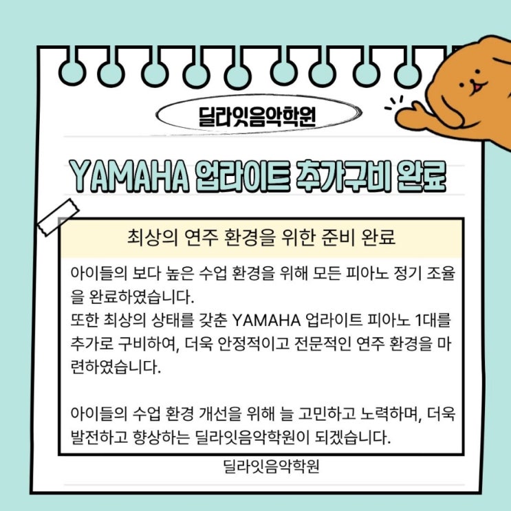 안녕하세요 딜라잇음악학원입니다 3월 신학기,새로운 소식을 안내드립니다❤️ 소식 하나, 최상급 퀄리티 야마하 업라이트 구비 ♡NEW PIANO YAMAHA♡ 최상급 퀄리티 야마하 업라이트 1대가 추가로 구비된 딜라잇음악학원 개원할 때 느꼈던 그 설렘 그대로 늘 한 자리에서 한결같이 쭈-욱 우리 아이들의 수업환경 및 퀄리티를 위해 늘 고민하고 연구하는 딜라잇이 되겠습니다. 감사합니다☺️ 소식 둘, 재원생들의 수업환경을 최우선 으로 생각합니다. 딜라잇음악학원은 늘 재원생의 안정된 수업환경 유지 및 퀄리티 높은 수업을 위해 늘 노력중에 있습니다. 밝은 분위기 속 다정함이 가득한 수업이지만 해야할 일들은 순서에 맞게 등원....... <img src="https://blogthumb.pstatic.net/MjAyNjAzMDNfNSAg/MDAxNzcyNTQ5ODY3MjQy.tr5731B8TYwHDrxTXQ5Pd2BbganpS3q-Dq2WTjjB9jgg.jEmy3IJYEfm-VbwAJkzJl8otlsALApn3qSIVvNmadZog.JPEG/900%A3%DF1772548356639.jpg?type=s3" />