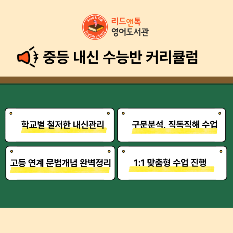 중등 내신 수능 전문반 독해 / 문법 / 영작 / 듣기 균형있는 수업으로 진행 1:1 개별 맞춤 진행 커리큘럼 잘하는 부분은 강화해주고, 약한 부분은 채워나가며 진행하는 학생에게 꼭 필요한 수업만을 진행 중학 문법 및 고등연계 문법 개념 완벽 정리 및 문제풀이 후 꼼꼼한 오답 진행 중학교 시기는 영어 실력을 잘 쌓아나가야 하는 아주 중요한 시기입니다. 한 영역에 치우쳐서는 안되므로 듣기, 독해, 문법, 영작과 어휘까지 학생의 본질적인 실력 향상을 위한 학습 비율로 진행을 하게됩니다. 기초가 약한친구는 무리한 독해와 문법을 하기보다는 듣기 비중을 늘려 기본 어휘와 문장 학습을 하며 독해와 문법을 쌓아갑니다. 중상위권의 친구들....... <img src="https://blogthumb.pstatic.net/MjAyNjAzMDhfNjQg/MDAxNzcyOTY0MTQzOTEw.wOf1twiDdxTQUCKm_jf3ODwcGeaWzytgQrC2xibEcgQg.amjE3qzt-ZcnAwrnFOIITtv6BHMZ9A3x6_LmizKkMG0g.PNG/%C1%A6%B8%F1%C0%BB_%C0%D4%B7%C2%C7%D8%C1%D6%BC%BC%BF%E4._%283%29.png?type=s3" />