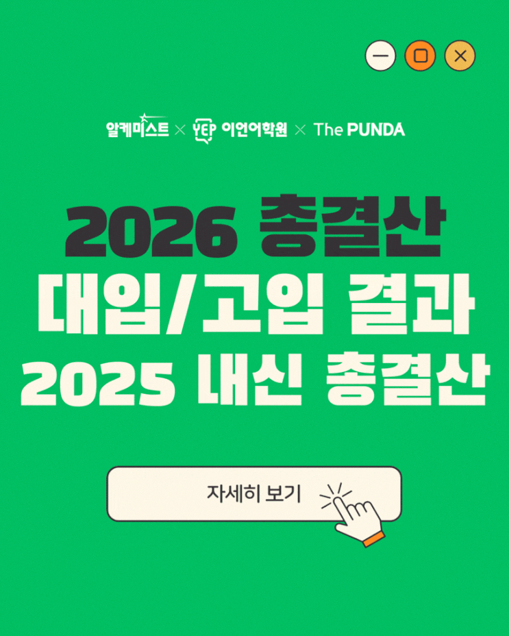 안녕하세요, 이언어학원입니다. 한 해의 끝에서 학생들과 함께 흘린 시간의 결과가 하나씩 숫자와 이름으로 증명되고 있습니다. 이번 포스팅에서는 2026 대입 결과, 2026 고입 결과, 그리고 2025학년도 내신 성적우수자 총합을 한눈에 정리해 소개해드리려고 합니다. 입시 결과는 하루아침에 만들어지지 않습니다. 학생의 꾸준한 노력, 정확한 학습 방향, 그리고 체계적인 관리가 함께할 때 비로소 좋은 결과로 이어집니다. 이언어학원은 매년 대입 결과, 고입 결과, 내신 성적우수자 결과를 통해 학생들의 성장을 증명해 왔습니다. 특히 이번 2026 대입 결과와 2026 고입 결과, 그리고 2025학년도 내신 성적우수자 총합은 이언어학원이 왜 영어....... <img src="https://blogthumb.pstatic.net/MjAyNjAzMDlfMjk4/MDAxNzczMDQ3NDQ4NjMy.sdNgYW7olQ5iWkoj1IdarjCVZabFAsJcW-da7vA-GbUg.Vv5mAMVN67akwHlC4glGI1p-WqI019KqHHRfSLOfCqIg.GIF/2026_%C3%D1%B0%E1%BB%EA.gif?type=s3" />