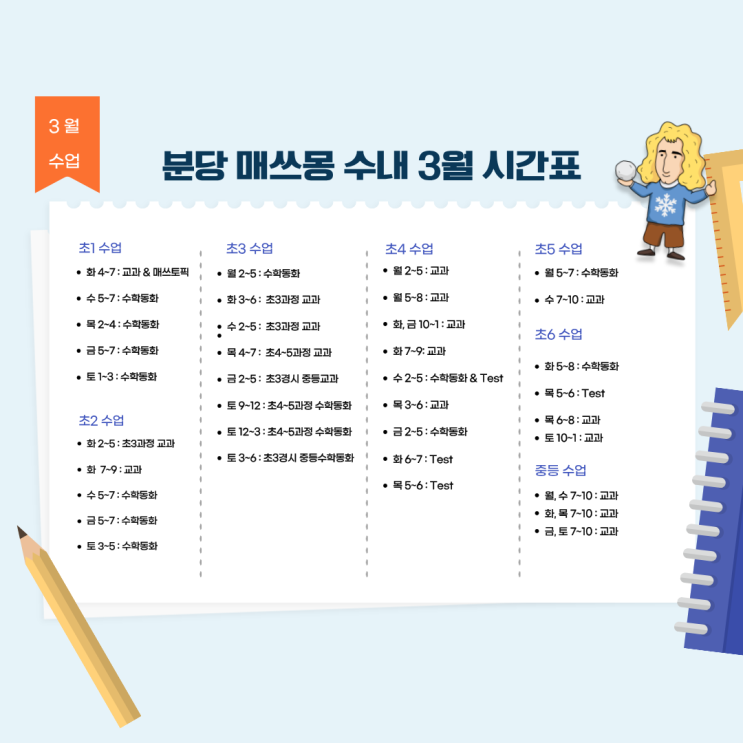 안녕하세요, 매쓰몽 분당수내센터입니다 새학기 새출발 시작인 3월 새로운 학교와 반에 적응하면서, 우리 아이의 부족한 부분을 채우거나 한 단계 더 도약할 수 있는 수학 학습의 '골든타임'입니다. 새학기 시작, 매쓰몽에서는 학년별로 꼭 필요한 심화 학습과 경시 대비, 그리고 개별 맞춤 학습까지! 빈틈없이 준비했습니다. <2026 3월 시간표>를 공개합니다! #매쓰몽 #수학 #내정초 #수내초 #불정초 #당촌초 #한가인초등학습 #수내중 #내정중 #초림초 #정자초 #낙생초 #분당초 #수학동화 #수학일기 <img src="https://blogthumb.pstatic.net/MjAyNjAzMDhfMTc1/MDAxNzcyOTc2OTgyMDQ3.0MKMHCyF6xLOtpgW7gs89Uy_-w18zzqKWmD-sPdpe2cg.FVP0T-yH_stLbtNHScvJv_My_h_pcy4OFFKBYTdXXFgg.PNG/%C1%A6%B8%F1%C0%BB_%C0%D4%B7%C2%C7%D8%C1%D6%BC%BC%BF%E4._%289%29.png?type=s3" />