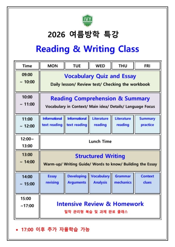 For Global Leaders with IVY 아이비 어학원 Specialized in Diagnostic Tailored Curriculum ● 자신만만 의사소통 중심의 영어교육 ● 유학 전문가들의 전략적 국제 학교 커리큘럼 ● 영역별 정확한 진단평가 맞춤형 수업 학습코칭 2026년 여름방학 특강 [Reading Class] Vocabulary Quiz and Essay Daily lesson/ Review test/ Checking the workbook Reading Comprehension & Summary Vocabulary in Context/ Main idea/ Details/ Language Focus 최신 주제의 토픽과 수준 높은 독해로 영어실력을 최상위권 단계로 도약할 수 있는 프로그램 다양한 주제와 분석적 리딩 실력 지도 풍부한 정보와 영영 풀이 탄탄한 어휘 학습 인문, 사회, 과....... <img src="https://blogthumb.pstatic.net/MjAyNjAzMDZfMTc1/MDAxNzcyNzk3NTU2OTc0.g5fKfXeNolJUVQvqe1FCjc-6scuk6WqufWPfDh_tLSIg.5YnvtUUY5pvNPeETwz8gR4jUbW2xmW9iq8-e7pCd94wg.JPEG/Screenshot_20260206_185612_KakaoTalk.jpg?type=s3" />