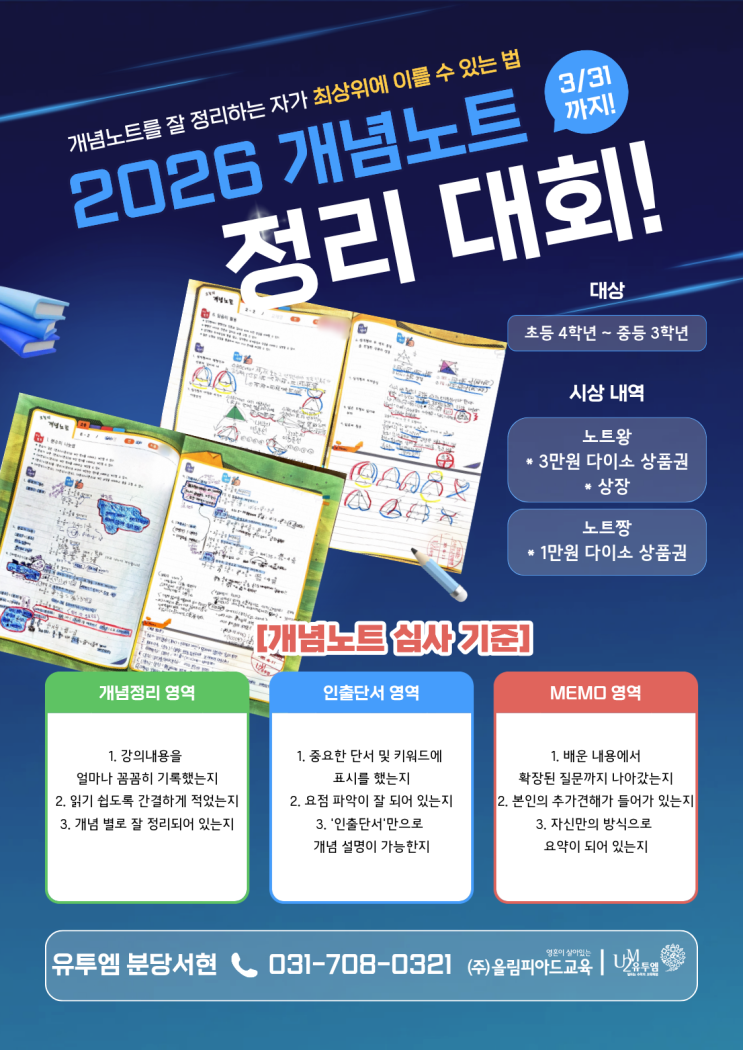 안녕하세요, 유투엠 분당서현입니다 바로 지금❗️ 분당서현 캠퍼스에서 개념노트 정리 대회가 진행되고 있다는 사실, 모두 알고 계셨나요? 개념노트 왜 중요할까? 꾸준히 수학 성적이 잘 나오는 학생들을 자세히 보면 공통점이 있습니다. 바로 "본인만의 개념노트"가 있죠. 개념노트는 단순한 필기 노트가 아닌, 배운 개념을 다시 정리하고 중요한 포인트를 구조화하는 과정입니다. 어떻게 써야 할지 모르겠다면! 아래 개념노트를 자세히 볼까요? 1. 개념을 '이해 중심'으로 정리 수업 시간에 들은 내용을 그대로 옮겨 적는 것이 아닌, 학생 스스로 핵심 개념을 다시 정리하는 과정입니다. 2. 개념의 연결 구조 수학이....... <img src="https://blogthumb.pstatic.net/MjAyNjAzMTBfMTI3/MDAxNzczMTQwMTkwNjg0._m6QJwz0FKskt3Dg0goj4ShnMj42u92NKtjP2spF-Ecg.mlS3XbErECVIdwuJWXbKtYVhEIRPGc5n_hOSxOTpvAAg.PNG/%C1%A6%B8%F1%C0%BB_%C0%D4%B7%C2%C7%D8%C1%D6%BC%BC%BF%E4._%2866%29.png?type=s3" />