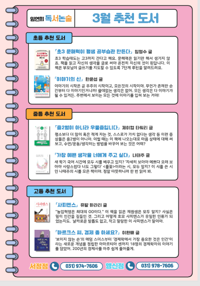 안녕하세요! 임연희 독서논술 국어전문 학원 입니다. 새 학기의 설렘을 채우는 3월 추천 도서 임연희 독서논술 학년별 추천 책 새 학기가 시작되는 3월입니다. ▶ 새 학기의 설렘을 채우는 3월 추천 도서◀ 이럴 때 좋은 책 한 권은 공부의 방향을 잡아 주고 생각의 깊이를 넓혀 줍니다. 임연희 독서논술에서는 학년별 교육과정과 연계해 3월 추천 도서를 준비했습니다. 초등·중등·고등 학생들이 지금 읽으면 좋은 책들을 학습 목표에 맞게 소개합니다. 초등부 ▶올바른 공부 습관과 창의력의 시작◀ 초등 시기 독서는 단순한 읽기를 넘어 생각하고 표현하는 힘을 기르는 과정입니다. 특히 초등 3학년의 문해력은 평생 공부 습관을 결정하는 중요....... <img src="https://blogthumb.pstatic.net/MjAyNjAzMDhfMjYg/MDAxNzcyOTI5MzYzNjcy.AxEk9tqOvJTPTr0aNsrTeQYbUM5MAz7CCaiQmSpu1vog.i9urv3JYOBb8T72EV1ckEla7RzC_KSkmEXL0VB0dGfMg.PNG/%BD%BA%C5%A9%B8%B0%BC%A6_2026-03-08_084823.png?type=s3" />