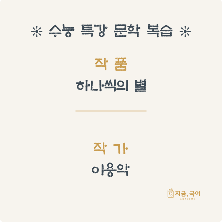 오늘 복습할 작품은 '이용악'의 「하나씩의 별」입니다. 이용악은 일제강점기 민중의 삶과 유랑의 현실을 노래한 시인으로, 수능 연계 교재에도 여러 차례 작품이 수록될 만큼 국어 문학에서 중요하게 다뤄지는 작가입니다. 작년 수능특강에서는 「전라도 가시내」, 수능완성에는 「오랑캐꽃」이 수록되었고 올해도 이용악의 작품이 실렸습니다. 우선 이용악 작가에 대한 키워드를 꼭 알고 갔으면 좋겠습니다. ❊ 이용악 작가 핵심 키워드 1) 1930~1940년대 - 이용악이 본격적으로 활동했던 시기로, 일제강점기의 사회적 현실이 작품에 큰 영향을 미쳤습니다. 2) 함경도 출신 - 북방 지역의 자연, 삶이 자주 등장합니다. 이러한 북방의....... <img src="https://blogthumb.pstatic.net/MjAyNjAzMDlfMjE5/MDAxNzczMDQyMDU1NDA2.FlHSIBnACvrgQuGwUfmkcIuOjPHbtz3w6r7r-T-F2-Mg.8hW14nKzIKa-XCIhfxEORePnZySRBR_vm2RzDPD-j_Ug.PNG/%C0%DB_%C7%B0.png?type=s3" />