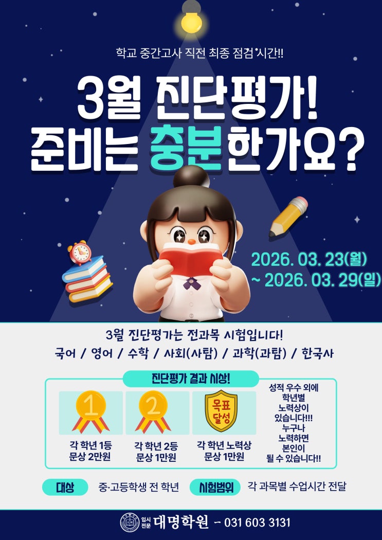 1학기 중간고사 대비 전 학원 자체에 실시하는 학력진단평가입니다. 2026년 3월 23일 ~ 29일까지 실시 할 예정입니다. <img src="https://blogthumb.pstatic.net/MjAyNjAzMDRfMjIy/MDAxNzcyNjEyNzczMzIy.HuoNnt7q8s-WTDZGoySBH2AFUPF0RHe_w2s0B8m8cPwg.heGwTYIpfuGPjEr591OkPZuKsF-NtIbcYqZL0PwPVrkg.JPEG/KakaoTalk_20260303_180344205.jpg?type=s3" />