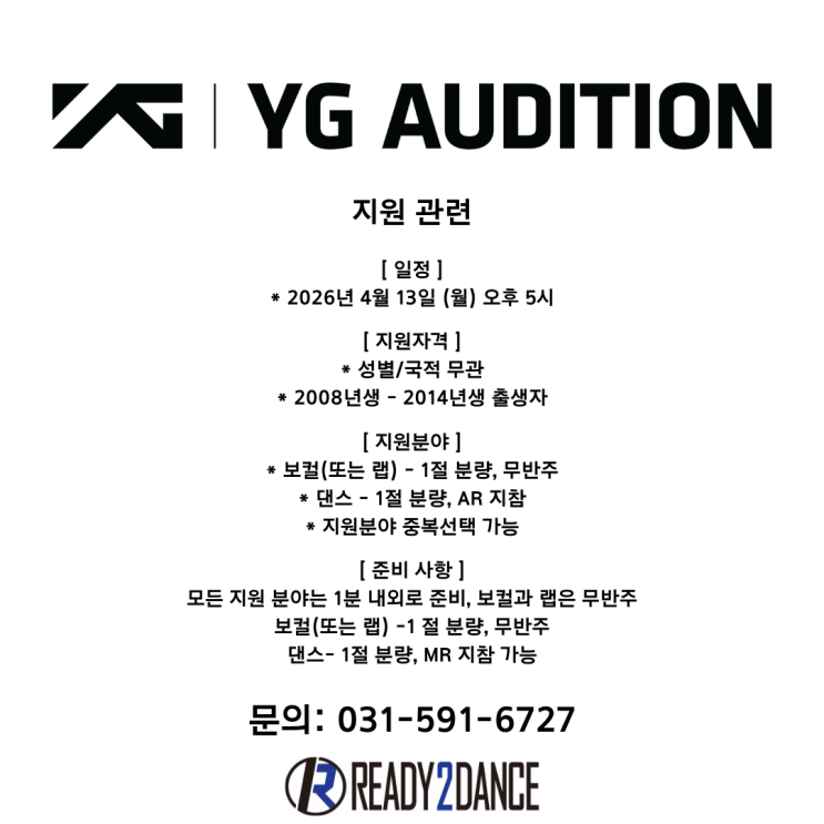 2026 레디투댄스학원 YG 엔터테인먼트 내방오디션! 안녕하세요. 레디투댄스학원에서 2026년 4월 13일 월요일 오후 5시에 2026 YG 엔터테인먼트 내방오디션을 진행합니다. 스타의 꿈을 갖고 있는 레디투댄스학원의 수강생이라면 누구나 참가 가능합니다! 그동안 갈고 닦았던 실력을 마음껏 뽐내주시길 바랍니다:) 오디션 참가를 원하시는 수강생분들은 아래 지원방법을 참고해주세요! [ 일정 ] * 2026년 4월 13일 (월) 오후 5시 [ 지원자격 ] * 성별/국적 무관 * 2008년생 - 2014년생 출생자 [ 지원분야 ] * 보컬(또는 랩) - 1절 분량, 무반주 * 댄스 - 1절 분량, AR 지참 * 지원분야 중복선택 가능 --------------------------------------------....... <img src="https://blogthumb.pstatic.net/MjAyNjAzMDNfMTEy/MDAxNzcyNTIyMDMyNzIy.iiTXrKUzX9HMbzdf6UpJIMxpZntCJlXZvHS_yO7UEyMg.XgmyWYsLZqXSovzUI_u7zXXcXAg_oMvPMQyHmIbgEKgg.PNG/2026_%BF%CD%C0%CC%C1%F6_%BF%C0%B5%F0%BC%C7.png?type=s3" />