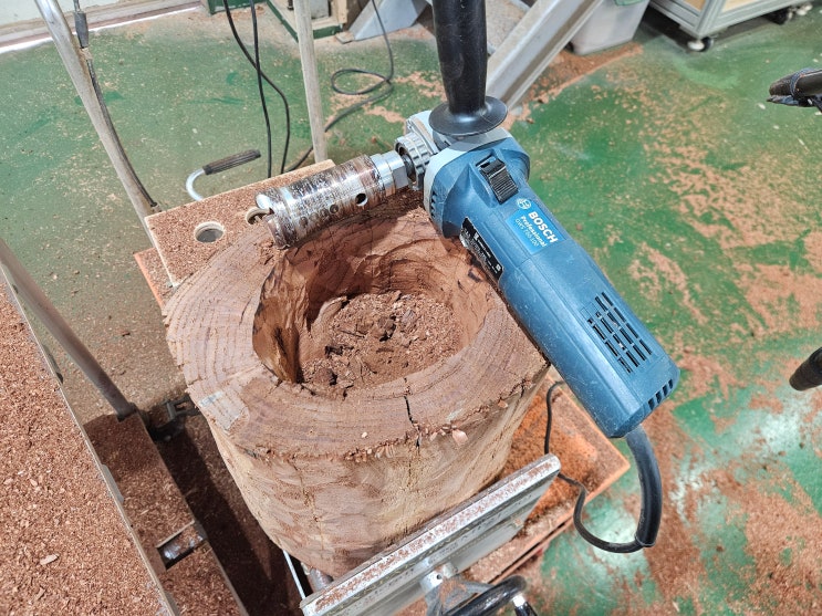안녕하세요 만파입니다. 속이 썩어버린 참죽나무를 활용하여 꽃병을 만드는 과정입니다. 버려질 수도 있었던 나무를 누구나 쉽게 나만의 작품으로 살리는 작업입니다. 1~2차 과정을 통해 내가 사용할 나무의 형태를 만드는 과정이였습니다. 3차 과정부터는 본격적으로 작품을 만드는 과정입니다. 먼저 속이 썩어 있는 통나무를 꽃병으로 쓰임을 주기 위해 홀스커터로 나무 속을 파내줍니다. 일정 깊이를 파냈다면 길이연장대를 홀스커터에 장착하여 더 깊숙한 부분까지 나무 속을 파내어 줍니다. 그라인더가 작업하기 어려운 좁은 공간 안쪽까지 홀스커터와 길이연장대를 사용하여 쉽게 나무 속을 낼 수 있습니다. 작업 또는 공구에 관심이 있으....... <img src="https://blogthumb.pstatic.net/MjAyNjAzMDZfMzQg/MDAxNzcyNzczMjExMjE2.bgwmbEYnbXwYmwvqAKLfsPmuaMZ0dlFWYzn4O7f9xWog.cl5tbLoTpD1wdPqBCHaqBcsfJs7_lmesC6at9Lm_dwgg.JPEG/20260303_104606.jpg?type=s3" />