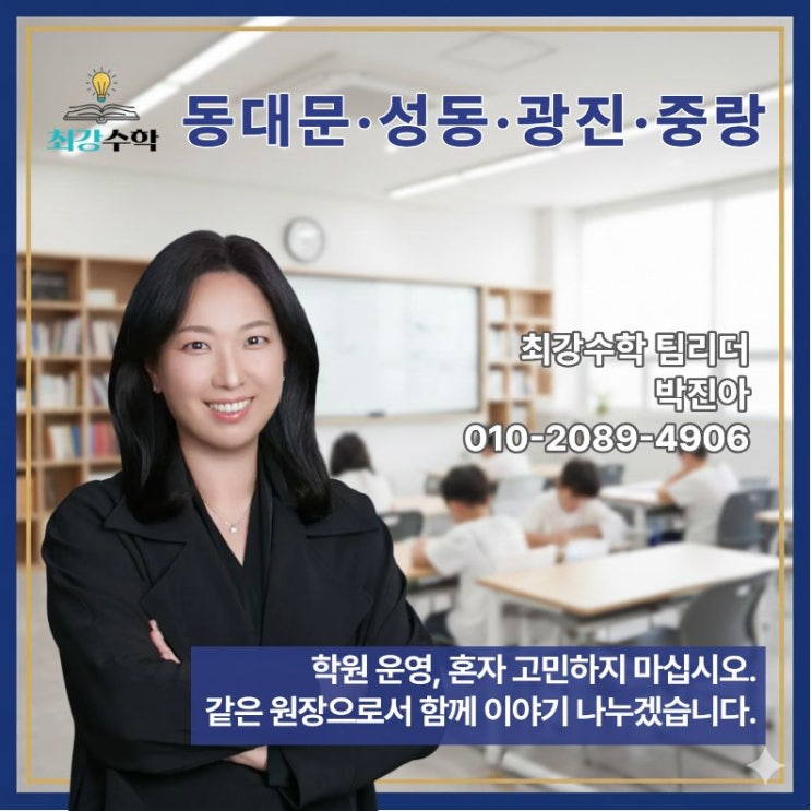 안녕하세요. 최강수학 동대문·성동·광진·중랑 팀리더 박진아입니다. 교육업에 몸담은지 벌써 22년이 지났습니다. 지난 세월 동안 수천 명의 아이를 가르치고 상담하며, 저 역시 예비 원장님들과 똑같은 고민을 하던 시절이 있었습니다. 시중에 이름만 대면 알만한 유명 프랜차이즈 가맹은 안 해 본 게 없을 정도로 거의 다 경험해 봤습니다. 대형 브랜드부터 시스템 중심의 공부방까지 직접 운영하며 그 장단점을 몸소 겪었습니다. 가맹비만 수천만 원 내고 본사의 규정에 묶여 답답했던 적도 있었고, 화려한 교재 뒤에 가려진 운영의 허점 때문에 밤잠을 설친 적도 많았습니다. 원장님들이 지금 어떤 고민을 하시는지, 무엇을 불안해하시는지 누....... <img src="https://blogthumb.pstatic.net/MjAyNjAzMDVfNDcg/MDAxNzcyNzA0MDU1OTQw.ykNE8EBr6W-NqzTQZdoIhX_YN8_YzSKL6jq0lmmmNAwg.AdesrC9xLVyJMMmwSvtIx1v-R-70F94UnknLc0mwL1Eg.JPEG/%C1%A6%B8%F1%C0%BB_%C0%D4%B7%C2%C7%D8%C1%D6%BC%BC%BF%E4._%285%29.jpg?type=s3" />