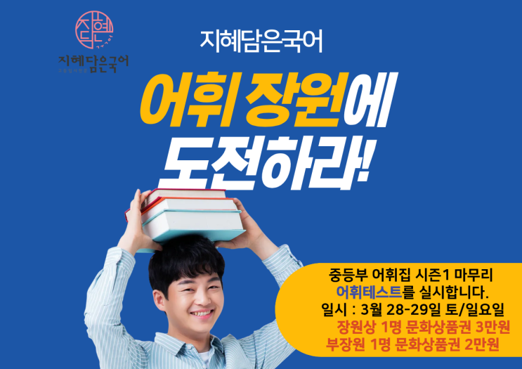 중등부 수능 국어 시즌1이 3월 22일 일요일 마무리 됩니다. 시즌1 동안 학습했던 어휘를 총정리하는 <지담국 어휘 장원 선발대회>를 실시합니다. 1. 시험 일시 : 2026년 3월 28일~29일 토,일요일 2. 시험 범위 : 중1~2 빠작 어휘집, 중3 수개잡 시즌1 어휘 (자세한 시험 범위 수업 시간 공지) 3. 우수자 선발 : 학년 장원 1명 문화상품권 or 올리브영상품권 3만원 학년 부장원 1명 문화상품권 or 올리브영상품권 2만원 4. 수상자 발표 : 4월 4일 토요일 학생들의 적극적인 참여를 부탁 드립니다. 3월 28일 토요일부터 시작되는 내신도 최고의 성적을 위해 최선을 다하겠습니다. <img src="https://blogthumb.pstatic.net/MjAyNjAzMjFfMjEw/MDAxNzc0MDU5NjM1OTgx.gYMd5tdhJ5gjGeBu55rldj75E3pWri9qiDSaG7sAzd8g.qg2o4c2C4CGEXe27_hDXKzRnI7foKX5cZwc2bdEIOa8g.PNG/%BE%EE%C8%D6%C0%E5%BF%F8.png?type=s3" />
