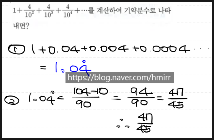 안녕하세요. 원탑 수학입니다. 오늘은 중 2,1학기 내용 중 순환 소수의 계산과 다항식의 계산을 한 문제씩 준비해 보았습니다. 어렵게 느껴지시나요? 학생들이 문제만 보고 풀 생각이 없이 모르겠어요 하는 문제 유형 중 하나입니다. 실제로 설명을 들으면 이렇게 쉽다고?? 하는 문제입니다. 처음 저 규칙을 보고 순환 소수로 바꿔야겠다는 생각이 안되어 모른다고 하는 경우가 대부분입니다. 이제 우린 어렵지 않게 풀 수 있겠죠?? 이 문제 또한 학생들이 많이 어려워라 하는 문제입니다. 일단은 문제가 길고 모르는 용어들이 나오니 안 풀고 싶고 모르고 싶은 거겠죠?? 용어는 자세히 몰라도 됩니다. 단위의 변환이라고 생각하고 접근해 보면 됩....... <img src="https://blogthumb.pstatic.net/MjAyNjAyMjNfMTc5/MDAxNzcxODIwNTgzOTQ5.v28P445BHS7i27I6itZBhNCQzxBjX8L2UhGPgAt9N3og.XXHDvrcKUZszByUMXMdV9TGpAIrL3z7k9vvdiKHZdTog.PNG/%C0%AF%C7%D1%BC%D2%BC%F6_%B1%E2%BE%E0%BA%D0%BC%F6.png?type=s3" />