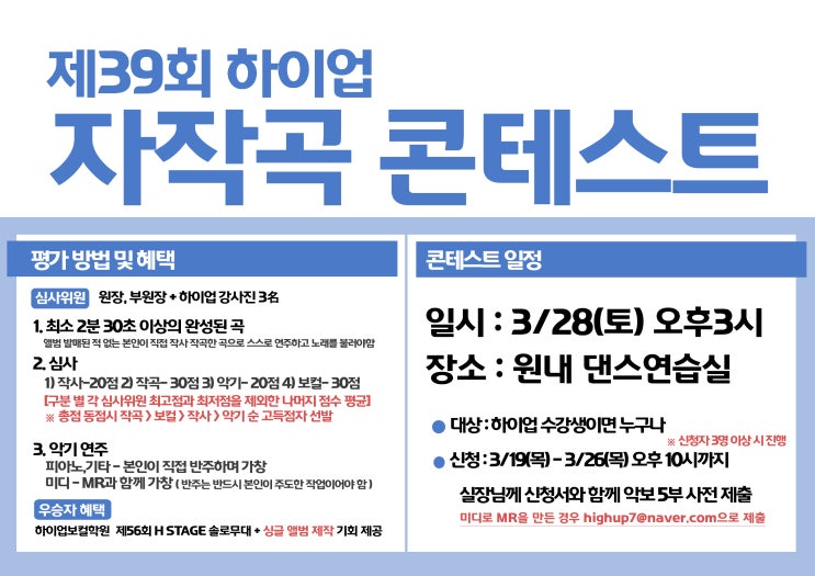안녕하세요 하이업보컬학원입니다 :) 날씨가 너무 좋아지고 있는 가운데 이제 곧 하이업보컬학원이 자랑! 하이업 자작곡 콘테스트가 진행됩니다! 일 시 : 3월 28일(토) 오후 3시 대 상 : 하이업 수강생 신청 : 3월 26일(목) 오후 10시까지 요즘은 단순히 노래만 잘하는 가수보다 자신의 이야기를 음악으로 만드는 싱어송라이터가 점점 더 주목받고 있습니다. 서울에서 싱어송라이터를 준비하는 학생 자작곡을 시작하고 싶은 보컬 전공생 자신의 음악을 만들고 싶은 취미생 이라면 하이업보컬학원의 자작곡 콘테스트는 좋은 목표가 될 수 있습니다. 1등에게는 실제 앨범 발매 기회 하이업보컬학원의 자작곡 콘테스트는 단순한 발표회가 아닙니다. ....... <img src="https://blogthumb.pstatic.net/MjAyNjAzMTRfMjAw/MDAxNzczNDcxODcxMDY0.XypEm-ZSiC43BrecoUzjWEhpZXu7eO6l1RSdhw6t5s4g.EtBcm6-CwYSh2JBGL6X0QPcu8mfOkymAjRpJC9Isl7Ig.JPEG/%C0%DA%C0%DB%B0%EE%C4%DC%C5%D7%BD%BA%C6%AE_%BE%C8%B3%BB.jpg?type=s3" />