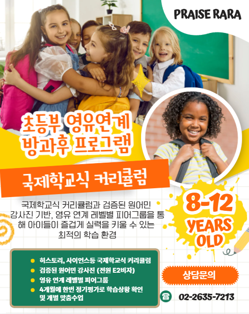 프레이즈라라 어학원 국제학교식 커리큘럼 베이스의 초등부 영유연계반 안내 드립니다. 프레이즈라라 영유연계반 프로그램은 기본 2점대원서 이상 읽기, 자유로운 말하기와 쓰기가 가능한 경우 부터 참여 가능하며, (해당 레벨에 부족한 경우는 비영유연계반 수업으로 참여 가능합니다) 하이 레벨에 해당하는 수업을 진행하실수 있도록 알고봤더니 국적이 모로코나, 러시아 같은 단순 "외국인" 선생님이 아닌, 교육청 가이드라인을 준수하는 7개국가에서 자격을 갖춘 진짜 "원어민" 선생님들과 진행합니다. 프레이즈라라는 짜임새 있는 교육을 제공합니다. 4개월에 한번씩 정기평가를 통해 각과목에 맞는 레벨을 재편성하여....... <img src="https://blogthumb.pstatic.net/MjAyNjAzMTFfMjUx/MDAxNzczMTk0OTM4MTI0.xorEKo9_ivzDtfGSnb9Fu9c8T50sBe0lEGxramqk5Bog.cyO4xKF2Sy3KRS9jEnTXNlvzvP7tGSmvLWxERQTsnVcg.PNG/image.png?type=s3" />