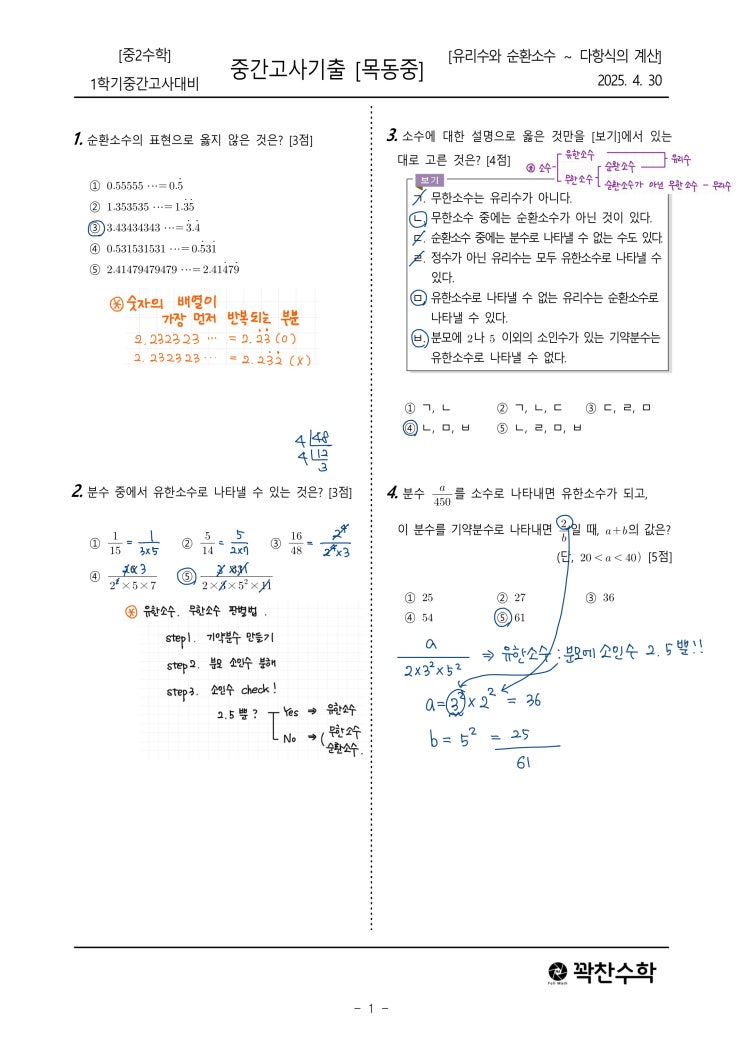 2025학년도 1학기 목동중2 중간고사 수학 분석 유리수와 순환소수 ~ 부등식의 계산 시험일 : 2025년 4월 30일 시험범위 : 유리수와 순환소수 ~ 부등식의 계산 전체 총평 목동중 2학년 1학기 중간고사는 문제 자체의 난도가 매우 높다기보다는 기본 개념을 얼마나 정확히 이해하고 있는지를 확인하는 시험이었습니다. 특히 단순 계산형 문제보다는 유리수와 순환소수의 정확한 개념 이해 분수를 기약분수로 변형하여 판단하는 능력 순환소수의 자리 규칙을 읽어내는 문제 지수법칙과 다항식 계산에서의 실수 없는 정리 능력 일차부등식의 성질을 정확히 적용하는 능력 을 고루 확인하는 구조였습니다. 전반적으로 보면 중상 난이도의 시험으로 볼....... <img src="https://blogthumb.pstatic.net/MjAyNjAzMTdfMTM0/MDAxNzczNzM4MTk3NTQ2.9CKiBI1MelGs2fW2pIl4SjaeaVRUhw6BSDFmKa4f-agg.lT-VOd5ZPJXvmlTxxkBOPUksNty3HH1daYiHHSH5lBAg.JPEG/KakaoTalk_20260317_174842128.jpg?type=s3" />