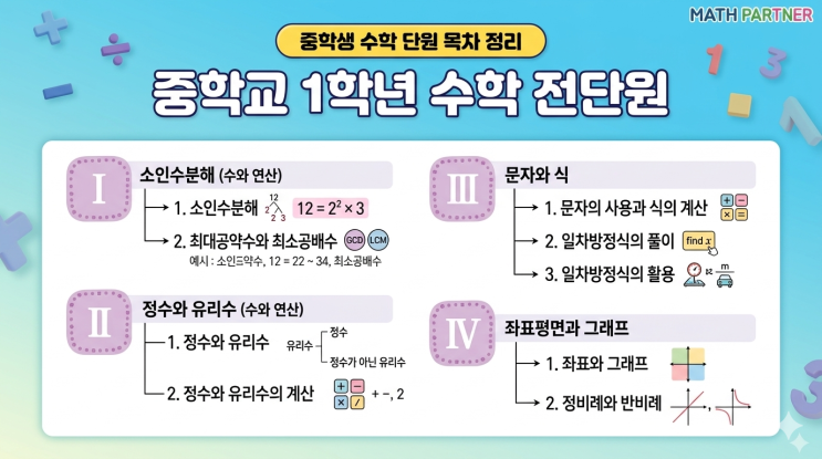 새학기 수학 골든타임! 중1 수학 주요 단원 & 필수 용어 완벽 정리 안녕하세요! 2009년부터 동탄에서 우리 아이들의 수학 자신감을 탄탄하게 키워온 수학파트너입니다. 따뜻한 봄바람과 함께 3월 새학기가 시작되었습니다! 특히 중학교에 갓 입학한 1학년 학생들과 학부모님들께서는 설렘 반, 걱정 반으로 하루하루를 보내고 계실 텐데요. 그중에서도 초등학교 때의 '산수'에서 벗어나 본격적인 '수학'으로 진입하는 중1 수학은 아이들이 가장 큰 부담을 느끼는 과목이기도 합니다. 지금 이 시기가 바로 중등 수학의 뼈대를 세우는 '새학기 수학 골든타임'입니다! 오늘은 수학파트너와 함께 중학교 1학년 1학....... <img src="https://blogthumb.pstatic.net/MjAyNjAzMTJfNiAg/MDAxNzczMzEyNzA0MDAx.c5ohKJI57DjaZFBeOsk8Bk5_4j1uX-J2CJ5Pxb9WQQkg.qOwm2UW5E9QMDczvGUnvFIrG8WflSx1dF8hsMkdHiHwg.PNG/Gemini_Generated_Image_oqcad1oqcad1oqca.png?type=s3" />