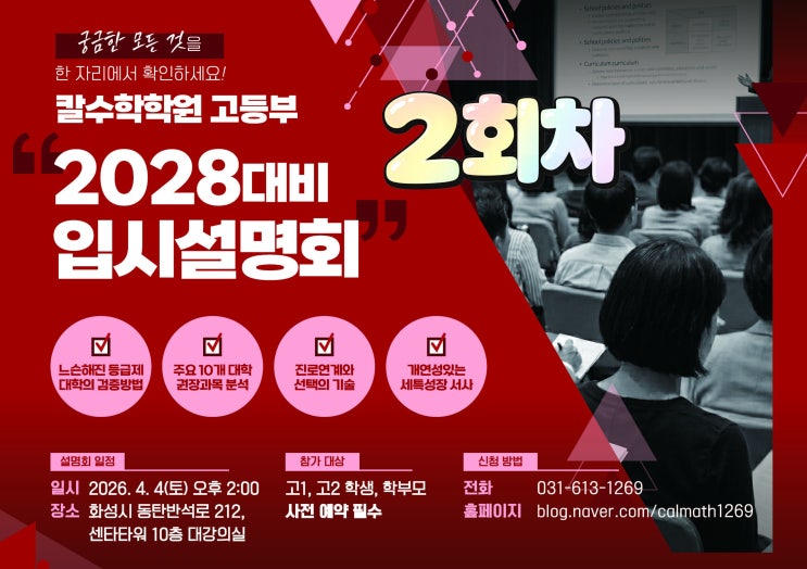 2028 대비 입시 설명회 2차 안녕하세요 1동탄 반송동 수학학원 칼수학 입니다. 많은 관심 속에 진행되었던 2028 대입 대비 입시설명회 1차 설명회가 마무리 되었습니다. 학부모님들과 학생들의 높은 관심으로 추가 문의가 계속 이어져 2차 설명회를 진행하게 되었습니다. 현재 고등학교 입시는 빠르게 변화하고 있습니다. 특히 2028 대입 개편안에 따라 학생들이 준비해야 할 방향도 크게 달라지고 있습니다. 이번 설명회에서는 ✔ 내신 등급제 변화에 따른 대학의 검증 방법 ✔ 주요 10개 대학 권장과목 분석 ✔ 진로 연계 과목 선택 전략 ✔ 개연성 있는 세특(세부능력특기사항) 성장 스토리 설계 방법 등 실제 학생들의 입시 준비에 꼭 필요한....... <img src="https://blogthumb.pstatic.net/MjAyNjAzMTZfMTk3/MDAxNzczNjQ2NDA3MjA4.V7GjX3K6qjhnEWe0yQVn5ivWtCw5dxjAq1yzq_z2DCEg.qZerTVQsoS1FtCmIq9BrU5cy2mW9jslymnS8d79eZBYg.JPEG/%C1%A6%B8%F1%C0%BB_%C0%D4%B7%C2%C7%D8%C1%D6%BC%BC%BF%E4._%2864%29.jpg?type=s3" />
