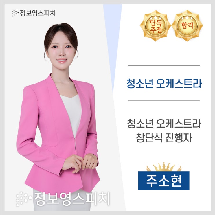 정보영스피치 단독추천으로 구립 청소년 오케스트라 창단식 진행자에 주소현 님이 최종 합격했습니다! 정보영스피치 아나운서 무한패스 과정을 시작으로 아나운서의 꿈을 시작했던 소현이는 박건우 원장님께 1:1 개인레슨을 받으며 그 꿈을 차근차근 이루어가고 있는데요. 방송 활동을 하면서도 늘 성장에 대한 목마름이 있었던 학생입니다. 스케줄이 없는 날이면 그냥 쉬기보다 아카데미에 와서 레슨을 받고, 연습을 하며 늘 스스로를 더 발전시키기 위해 노력해왔는데요. 그렇게 한 걸음씩 실력을 쌓아가던 소현이에게 이번에는 정보영스피치 단독추천으로 구립 청소년 오케스트라 창단식 진행자라는 뜻깊은 기회가 찾아왔고, 당당히 최....... <img src="https://blogthumb.pstatic.net/MjAyNjAzMTJfMTE2/MDAxNzczMjkwNTc0NDgw.EXrza2pJRhbO6x7ms_TBsiqHtwT8wi4U9fwYmcVa0Dwg.qPLOPv-zQQLhqdL-jpjao-4aYH8c5r3adPxhWiOoz9kg.JPEG/KakaoTalk_20260311_124737453_02.jpg?type=s3" />