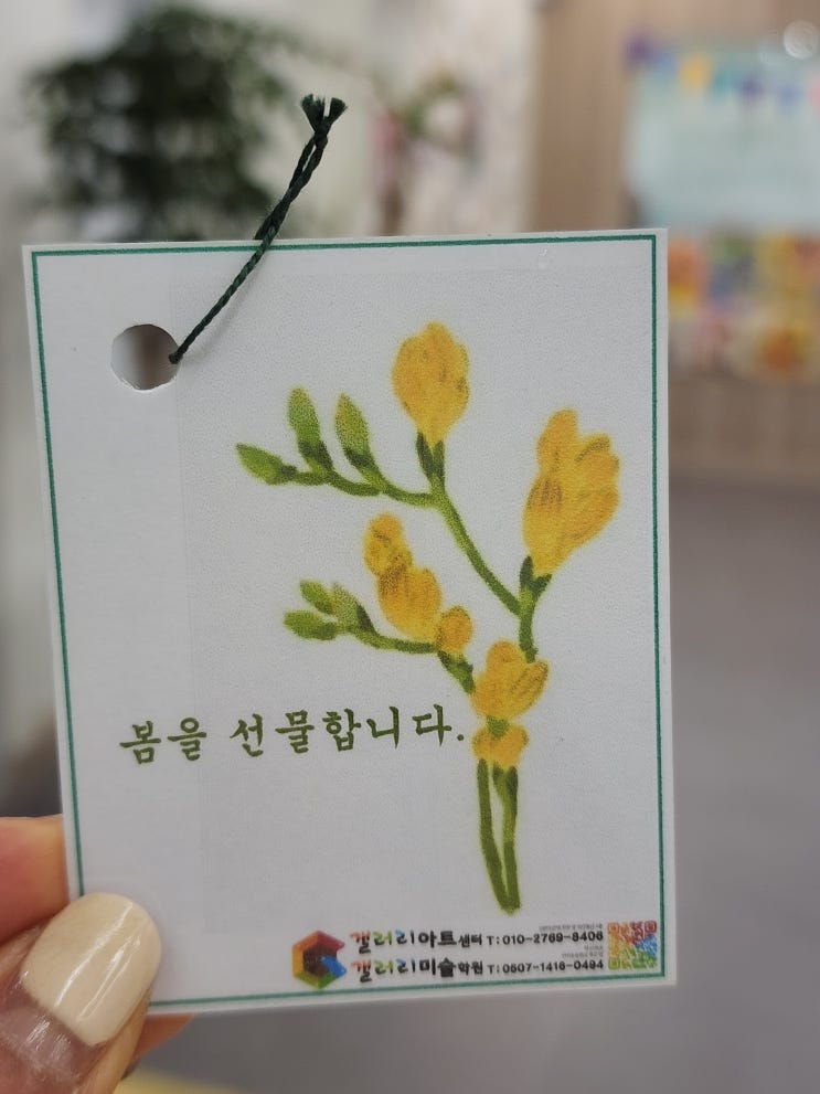갤러리에 찾아온 봄 이야기 어느새 살랑살랑 따뜻한 바람이 불어오더니, 우리 갤러리에도 봄이 찾아왔어요~ 오늘 교실에는 향긋한 프리지아 꽃향기가 가득 퍼졌답니다! 노란색 예쁜 프리지아를 보며 아이들의 눈이 반짝반짝✨ “선생님, 이 꽃 향기 너무 좋아요!” “꽃잎이 꼭 나비 같아요!” 아이들은 각자의 느낌을 말하며 꽃을 한참 동안 관찰했어요. 코로 향기를 맡아보고, 손으로 조심스럽게 만져보고, 꽃잎의 모양과 색깔을 자세히 들여다보는 시간 자연을 오감으로 느끼는 소중한 순간이었답니다. 그리고 이어진 활동은 바로 그림으로 표현하기! 아이들은 자신이 느낀 프리지아를 자유롭게 그려보았어요. 누군가....... <img src="https://blogthumb.pstatic.net/MjAyNjAzMThfMjMw/MDAxNzczODM4NjU4MTI2.8LxvezTMA-KSWx-9zqfHXcgYSTu7G6B1erqjMSfZAYIg.6d6soPVoQmc8HHIMCnCSDKJf8EVu9rKzOovm3SY_w-kg.JPEG/20260310_085001.jpg?type=s3" />