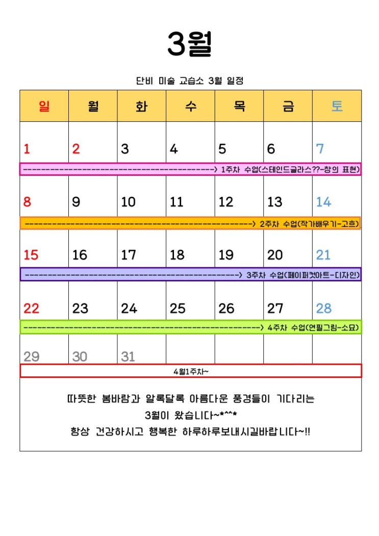 안녕하세요~!! 단비 미술 교습소 원장 조단비입니다. 3월 벌써 새학기가 돌아왔네요~!! 두근 두근 설레는 마음으로 새로운 반, 학년, 친구들과 같이 재미있는 1년 보내길 바랍니다~*^^* 봄의 시작을 알리는3월 따뜻해지고 아름다운 꽃들이 피는 봄, 설레는 마음을 안고 이번달은 어떤 재미있는 수업들이 있는지~!! 우리가 평소에 자주보는 호일!! 호일로하는 스테인드글라는 어떤 작품으로 탄생할지~!! 기대해보며 수업을 진행해보아요~!! 두번째수업은 우리가 많이 알고있는 "고흐"라는 화가의 작품들을 알아보고 배워보며 "고흐"특징들을 알아보아요~!! 세번째수업은 "페이퍼 컷 아트"를 배워보느시간입니다~!! ....... <img src="https://blogthumb.pstatic.net/MjAyNjAzMDlfNzMg/MDAxNzczMDM5NDQwNjI0.PGPS3T1FxmxGCVf96iKgYnMWFoZn56KJtbnW-DCG6-Yg.IJ60KMGQZ4T1a6VJaDSv7gs9GmSfHIfD95hxSJcJ9S8g.JPEG/3%BF%F9_%C0%CF%C1%A4%C7%A5_0001.jpg?type=s3" />