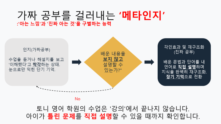안녕하세요, 학생들의 영어 공부를 책임지는 토니 영어학원입니다. 새 학기가 시작되면서 우리 아이 영어 공부, 어떻게 시켜야 할지 고민 많으시죠? 학원에서 단어도 많이 외우고 숙제도 꼬박꼬박 하는 것 같은데, 막상 시험을 보면 성적이 오르지 않아 답답해하시는 학부모님들이 정말 많습니다. 그 이유는 바로 우리 아이가 '가짜 공부'를 하고 있을 확률이 높기 때문입니다. '아는 느낌'에 속지 마세요! (가짜 공부 vs 진짜 공부) 아이들은 수업을 듣거나 해설지를 보고 고개를 끄덕이면 본인이 '이해했다'고 착각합니다. 눈으로만 익힌 단기 기억, 즉 '재인지' 상태에 머무르는 것인데요. 이런....... <img src="https://blogthumb.pstatic.net/MjAyNjAzMTNfMTg0/MDAxNzczMzg0NjI4MjUy.jK0JNxvjV3BOopJE7r0nYdbW9L5teCnQnQvG058CdcEg.pUqI01pQwmramqaxbE1cVc488k69E5Pc-NrP1hMZpFcg.PNG/%BD%BD%B6%F3%C0%CC%B5%E52.PNG?type=s3" />