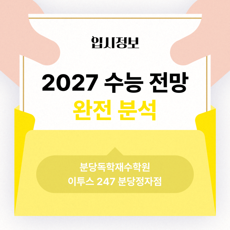 안녕~ 오늘은 27학년도 수능의 전망을 한 번 분석해볼게! (출처: https://www.jinhak.com/jh/high3/univ-entrance-info/ipsi-analysis/ipsi-strategy/100000449) 달라지는 점 2027 수능에서는 고3 감소, 재학생 축소 N수생 증가, 졸업생 재도전 사탐 80% 시대 개막 이 변화의 키워드일 것 같아! 고3 감소 : 08년생 출생아 수 감소, 재학생 규모 42~43만 명으로 축소 총 접수자 동반 하락 N수생 증가 : 졸업생 풀 증가 (07년생->졸업생) 수능 체제 전환 전 막차 심리 의대 증원 기대감 (지역의사제, 공공의대) 사탐 80% 돌파 : 2025년 고2 모의고사에서 59.2% 달성 전년 대비 +6.4%P 높은 수준 2027 수능에서 80% ....... <img src="https://blogthumb.pstatic.net/MjAyNjAyMjRfMTMw/MDAxNzcxOTA2MTI4NDk3.mxJrLT1nheTcsrVYJI6KamMJ-mOIOyIJVuBRKUFmTjAg.H7AVh3KeEVKURwbUaCnbRKzp0frzY_UnyhdB-yIHa08g.PNG/%BA%ED%B7%CE%B1%D7-%BD%E6%B3%D7%C0%CF-004.png?type=s3" />