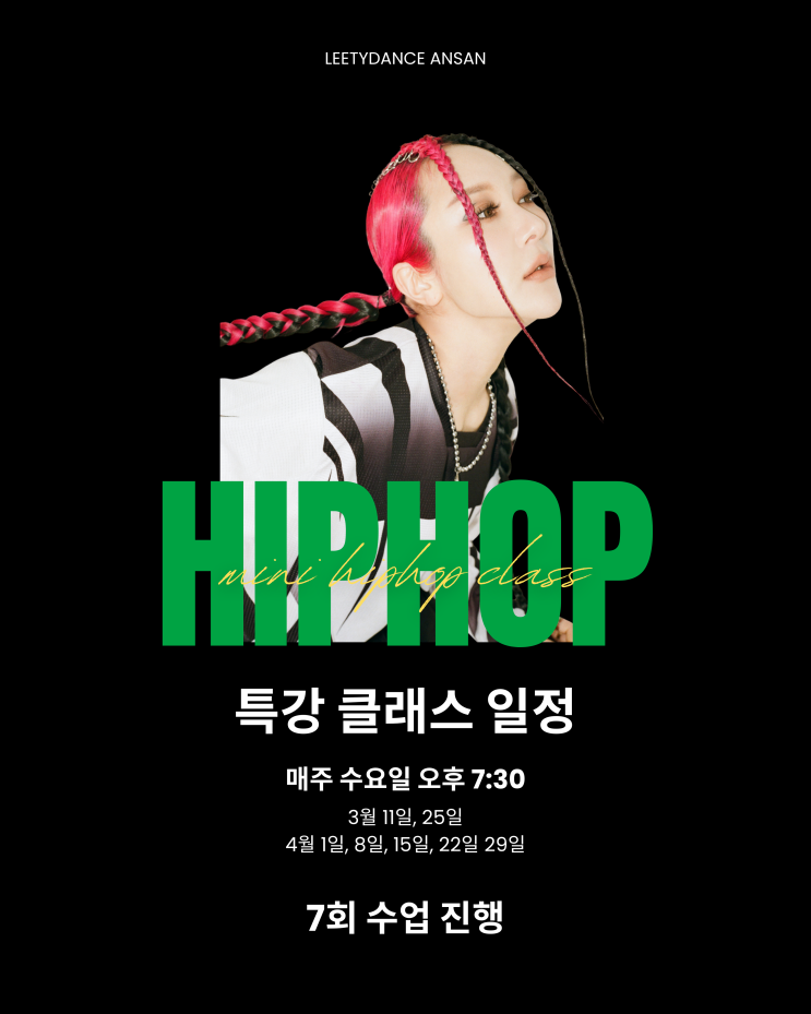 안산 댄스학원 리티댄스 안산 교육청 등록번호 제 4654 호 안녕하세요 리티댄스아카데미 안산점 입니다. 이번 리티댄스 소식은?! 힙합 댄서로 왕성한 활동과 스우파에도 출연한 슈퍼 댄서! MINI POP UP CLASS 입니다. 힙합 댄서 미니 쌤은 지난 25년 겨울방학에도 방학 특강 팝업 클래스를 진행 해주셨었는데요! 올해는 조금 더 긴 기간으로 찾아뵙게 되었습니다. 오직 리티댄스 안산점에서 댄서 미니만의 힙합 안무를 배우며 매력을 느끼실 수 있습니다. '수강기간 및 수강료 안내' 3월 수강일정 3월11일, 3월25일 4월 수강일정 4월1일, 8일, 15일, 22일, 29일 총 7회 수업으로 진행되며 매주 수요일 7:30~8:30 1시간 수업으로 진행됩....... <img src="https://blogthumb.pstatic.net/MjAyNjAzMDRfOSAg/MDAxNzcyNTk2MjIzNzIx.zlvrYPtlK7iaEp2HXpXuTErGBpI7ATeOFSf1gJFn-GEg.e0Bis1h4PygHwzWIW9igK9Bw9zUCW4I1ndnVkfD4s6Eg.PNG/%B9%CC%B4%CF%C6%CB%BE%F7.png?type=s3" />