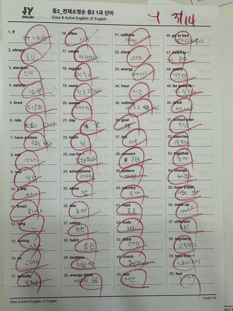 단어암기 본문해석 이 친구는 같이 공부한지 한달이 안된 친구이다. 주어와 동사 목적어 보어 구조를 파악해 해석하는 것이 아니라 단어를 조합하여 의미를 만들어 내는 식의 해석을 하고 있다. 짧은 문장에서는 어느 정도 맞을지 모르지만, 문장이 복잡해지는 중3부터는 이런식의 해석은 큰 문제를 만든다. 주어와 동사의 개념부터 설명하고 영어에서 어순이 가지는 의미의 중요성을 설명해 주었다. 또 한가지, 전치사의 의미를 제대로 암기하지 않아 해석을 하지 않거나 엉뚱하게 해석을 하고 있다. 이것 또한 해석에 큰 오류를 만들어 낼 수 있기 때문에 정확한 의미를 알려주고, 뒤의 명사와 함께 해석할 수 있도록 알려 주었다. <img src="https://blogthumb.pstatic.net/MjAyNjAzMTZfNSAg/MDAxNzczNjQ2NTYwMDg3.Fu-HQtxGestfdswa4Pn2RVpHB8cFI9eWQvEr9vHnMIQg.c_lvB0vTLWXkeJEL-ylcapFEykoErLFDs8c0oVlnKpMg.JPEG/KakaoTalk_20260316_163341030_03.jpg?type=s3" />
