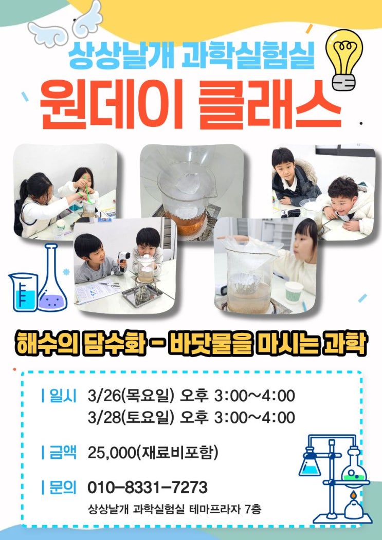 바닷물을 마시는 과학? 상상날개 '해수의 담수화' 원데이 클래스! 우리 아이들에게 가장 필요한 건 교과서 밖의 생생한 체험! 상상날개 과학실험실[평내호평점]에서 특별한 원데이 클래스를 준비했습니다. 갈증 나는 무인도에 갇힌다면? ️ 바닷물을 어떻게 마실 수 있는 물로 바꿀까요? 직접 실험하며 원리를 배우는 시간! 지구의 물 부족 문제와 과학적 원리를 직접 눈으로 보고 손으로 만지며 배우는 시간입니다. 이미 많은 2~6학년 친구들이 패키지 과정으로 신나게 배우고 있는 바로 그 수업을 하루 동안 체험해 볼 수 있는 절호의 기회입니다. 수학·과학 패키지로 실속 있게 공부하는 친구들이 선택한 상상날....... <img src="https://blogthumb.pstatic.net/MjAyNjAzMTFfMTY5/MDAxNzczMTYxODU2NDQy.CueJtaJK_KCKiZEcUi3X1i8wEGwDv3wjHfK33m2Y_Z0g.IgvdSDgQQva-pSSzdnnqbjLeUnAAfXFD4zOqnRIafjsg.JPEG/KakaoTalk_20260311_015300356.jpg?type=s3" />