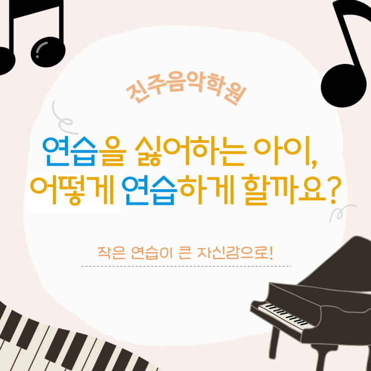 안녕하세요 아이들의 음악적 성장과 즐거운 배움을 함께하는 진주음악학원입니다 피아노를 가르치다 보면 많은 학부모님들이 이런 고민을 하십니다. “우리 아이는 연습을 잘 안 해요.” “악보만 봐도 어렵다고 하면서 치려고 하지 않아요.” 사실 많은 아이들이 처음부터 연습을 좋아하는 것은 아닙니다. 특히 새로운 곡을 시작하거나 진도가 조금 어려워지면 부담을 느끼고 피하려는 경우도 종종 있습니다. 연습이 싫은 아이에게 필요한 방법 ✏️ 얼마 전 수업에서도 비슷한 상황이 있었습니다. 새로운 곡을 시작하려고 하니 아이 스스로 “어려워요. 안 칠래요.” 라며 악보 보는 것조차 부담스러워했습니다. 그래서 그날은 진도....... <img src="https://blogthumb.pstatic.net/MjAyNjAzMTJfMTU3/MDAxNzczMjk1NTU3MzE1.QeSsFe24A1HbX5BFH7e2Nj3VH8JnkeWdjDiF1rzv6_gg.6KHJplMELXDDaOmfFovlqVxHrU0-38H2wJ8S7dMqj3kg.PNG/%BD%E6%B3%D7%C0%CF%BF%EB_%281%29.png?type=s3" />