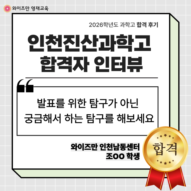 과학고 진학, 언제부터 준비해야 할까요? 초등 고학년부터 목표를 세우고 준비하는 학생이 있는가 하면, 중학교에 들어서야 방향을 잡는 학생도 있습니다. 시작점은 같지않지만 한 가지 공통점은 있습니다. 어느 순간, 수학이든 과학이든 자신이 진짜 좋아한다는 것을 스스로 느낀 순간이 있었다는 것. 2026학년도 인천진산과학고에 합격한 와이즈만 인천남동센터 조○○ 학생에게도 그런 순간이 있었습니다. 2026학년도 와이즈만 과학고 합격자 스토리, 오늘은 인천진산과학고에 합격한 와이즈만 인천남동센터 조○○민 학생의 이야기를 전합니다. 과학고 도전의 분기점 된 중1 겨울방학 평소 수학을 좋아하고 흥미를 느끼긴 했지만, 본격적으로....... <img src="https://blogthumb.pstatic.net/MjAyNjAzMDdfMjA1/MDAxNzcyODcyODU3NjEz.nINuS2_juaRawDZ1LMM4zuqrR4riJZVPNcnSDZp6bjIg.joxbpck7ZKnOFnrtf31tL-h8OIj2pVwrGJ4aZnip6Jsg.PNG/%C7%D5%B0%DD%BB%FD-%C8%C4%B1%E2_%B0%E6%B1%E2%B0%FA%C7%D0%B0%ED%B5%EE%C7%D0%B1%B3-003_%282%29.png?type=s3" />