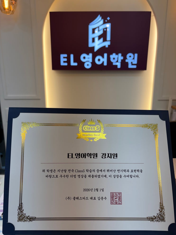 클래스무비 수상! 우리 EL이들이 해냈습니다! 우리 EL학원 아이들이 클래스무비에서 전국 최우수상을 받았는데요, 이 상은 단순히 영상 하나를 잘 만들어서 받은 결과가 아닙니다. 아이들의 꾸준한 듣기 훈련, 반복 읽기, 완성도 높은 더빙 연습이 만들어낸 성장의 결과입니다. 아래 링크에서 EL이들의 더빙 영상을 확인해보세요 ! 상장을 전달하는 순간, “우리가 해냈다!” “다음에도 또 해요!” 서로 하이파이브를 하고, 사진을 찍고, 웃음이 끊이지 않았던 시간 ! 그 모습이 너무 예뻐서 괜히 제가 더 뿌듯했습니다. 이 상은 누군가 대신 만들어준 결과가 아니라, ✔ 반복 듣기 ✔ 철저한 따라 읽기 ✔ 포기하지 않은 연습 ✔ 지속적인....... <img src="https://blogthumb.pstatic.net/MjAyNjAyMjZfMjQ5/MDAxNzcyMDk3MjM3NjYz.fXzI5t4gZVkI4EOJ_em0wXW9xHJj5gpWmV-nRbZbLEwg.IA471PjOSE3uXgEciNT3EnU4XLNOEWf5T_g1jiXrdA4g.JPEG/KakaoTalk_20260226_180324519.jpg?type=s3" />