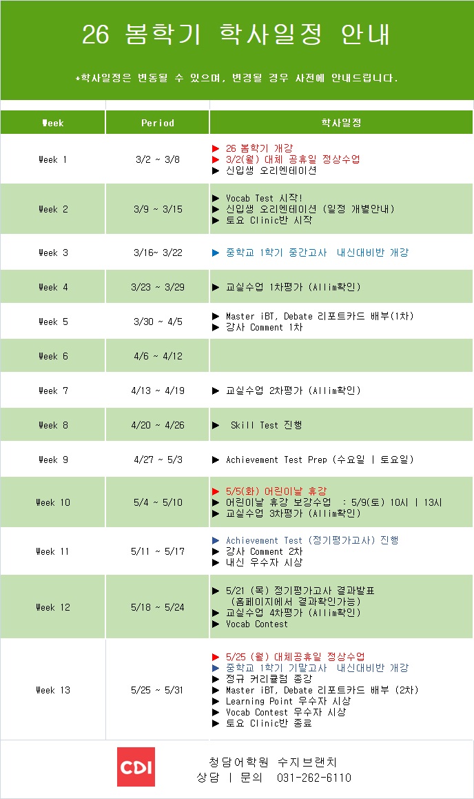 안녕하세요. 청담어학원 수지브랜치입니다 ♥ 새로운 봄의 시작과 함께 2026학년도 봄학기 학사일정을 안내드립니다. 주요일정 안내 ♥ 3월2일(월) 봄학기 개강 ♥ 3월16일(월) ~ 3월22일(일) 중학교 1학기 중간고사 내신대비반 개강 ♥ 5월5일(화) 어린이날은 휴강예정으로, 해당 수업일은 5/9(토) 10시 / 13시 보강수업 진행 예정 입니다. ※참여 가능여부는 추후 구글폼으로 메세지 발송 예정 ♥ 5월11일(월) ~ 5월15일(금) Achievement test (정기평가) 진행 ♥ 5월25일(월) 대체공휴일 정상수업 진행 ♥ 5월25일(월) ~ 5월31일(일) 중학교 1학기 기말고사 내신대비반 개강 ♥ 5월29일(금) 봄학기 종강 문의사항은 학원으로 연락주세요 :-) 감....... <img src="https://blogthumb.pstatic.net/MjAyNjAzMDlfNTUg/MDAxNzczMDYwNjgwMzgx.Pjek8z5dqeezsXiA0w1FS-ehfa56LjX17Grw4XQHe_0g.-gp18bsuzkpxMo4Snx6DDqoQvH0kvSepVXU86PGx09Qg.JPEG/%BA%BD%C7%D0%B1%E2_%C7%D0%BB%E7%C0%CF%C1%A4_0309.jpg?type=s3" />