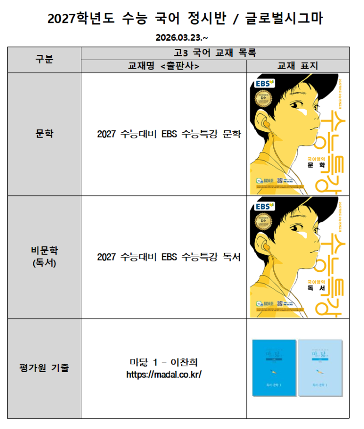 안녕하세요! 글로벌시그마 국어파트입니다. 본격적인 수험생 모드에 돌입해야 할 3월, 내신 준비와 수능 대비 사이에서 고민이 많으실 텐데요. 3월 4주차(3/23)부터 고3 정규 과정을 내신 대비반과 분리하여, 오직 수능 국어 대비에 집중하는 [수능 국어 정시반]을 개강합니다. 아래와 같이 일반적인 커리큘럼이지만 차별화된 수업으로 수능 국어 1등급 또는 등급향상의 토대를 만들고자 합니다. 2027학년도 수능대비 국어 정규·정시반 개강 안내 1. 수능 국어 정시반 개요 개강일: 3월 23일 (월)부터 대상: 고3 학생 및 N수생 목표: 3월부터 7월까지, 수능 국어 1단계 완성 2. 수업 방식 및 커리큘럼 단순히 문제를 많이 푸는 것이 아니라, ....... <img src="https://blogthumb.pstatic.net/MjAyNjAzMTJfMjQx/MDAxNzczMzA2NzA5MzU4.l_0rBGnZ0ro6ktddXUbrvHgmT83ronAyLDfr9W5RdAEg.-5q7epy_Eqv7KcoyMWGpAQlkdIfg3Y4aoTKNKPktIG4g.PNG/image.png?type=s3" />