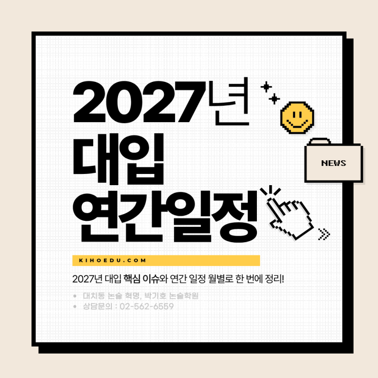 안녕하세요. 박기호 논술입니다. 오늘은 2027학년도 대입을 준비하는 학생과 학부모님이 꼭 알아야 할 2027 대입의 핵심 특징 연간 일정과 수험생이 어떻게 준비해야 하는지 한 번에 정리해보겠습니다. 2027 대입 핵심 요약 2027 대입은 예년보다 더 복잡합니다. 의대 정원 확대 이슈가 다시 이어지고 있고, 서울대·KAIST 등 첨단학과 확대도 예정되어 있어 최상위권부터 중상위권까지 합격선 예측이 훨씬 어려워진 상황입니다. 2028 대입 개편을 앞둔 마지막 해라는 점까지 겹치면서, 수험생 입장에서는 수시·정시 어느 하나만 보고 준비하기 어려운 해가 될 가능성이 큽니다. 2027 대입 월별 일정 정리 3월 : 학평 시작, 대학별고사....... <img src="https://blogthumb.pstatic.net/MjAyNjAzMjBfMTI0/MDAxNzczOTk3NjczNTU2.-cHvJk9PtgAIzNO3UEVrG4GY2uwFhb4hkK5h3fMazCcg.l5US3bJgKna5mZ_9-TJRaHBiUCCs_dmwPj09uCTRycUg.PNG/%C1%A6%B8%F1%C0%BB_%C0%D4%B7%C2%C7%D8%C1%D6%BC%BC%BF%E4._%2826%29.png?type=s3" />