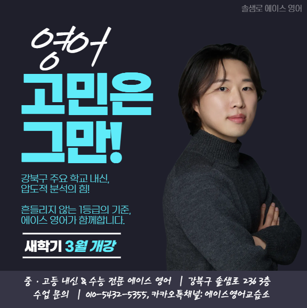안녕하세요, 고등부 영어의 역전을 만드는 에이스영어 원장입니다. 새 학년의 설렘도 잠시, 고등학생 자녀를 둔 학부모님들의 가장 큰 고민은 역시 '내신'과 '수능' 두 마리 토끼를 어떻게 잡느냐일 것입니다. 특히 강북구 주요 고등학교들의 영어 내신은 학교별로 스타일이 매우 다르기 때문에, 전략 없는 공부는 시간 낭비가 되기 쉽습니다. 에이스영어에서 준비한 ✨고등부 내신 및 수능 대비 개강✨소식을 전해드립니다. 우리 학교 시험, 제대로 알고 대비해야 합니다. 에이스영어는 학원 인근 주요 고등학교의 최근 3개년 기출 데이터를 바탕으로 밀착 지도를 진행합니다. 솔샘고 · 삼각산고 방대한 시험 범위와 부교재....... <img src="https://blogthumb.pstatic.net/MjAyNjAzMDlfMjE4/MDAxNzczMDYzODU2NDE3.eSjlehqwPAXZb-_YJdyHBKEqPU6bzqnn02ieh5iJZLsg.8tdxIhda-whuRIarEEI1Sw4eKz9xAGppdGL09VmnQiEg.PNG/image.png?type=s3" />