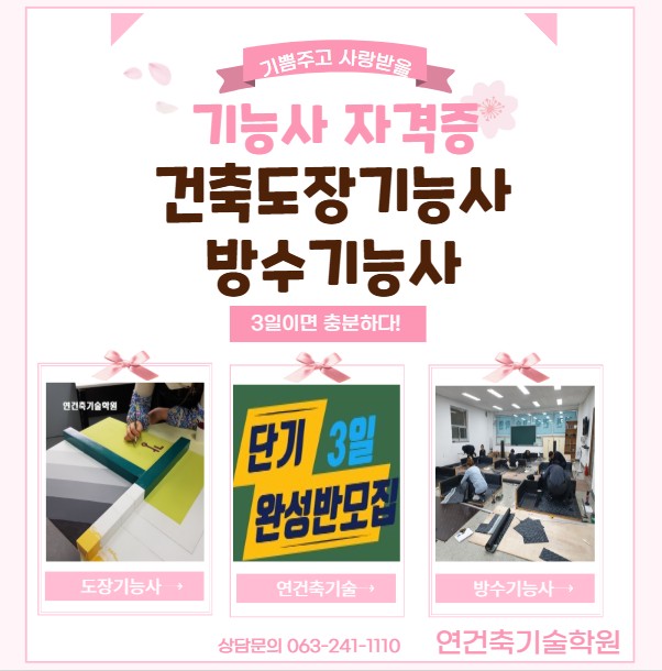 전주건축도장기능사, 전주방수기능사 기능사 자격취득 전문 훈련기관 연건축기술학원입니다. 요즘 학원 상담을 하다 보면 조금 특별한 계기로 자격증에 도전하는 분들을 종종 만나게 됩니다. 바로 자녀의 권유로 시작되는 자격증 도전입니다 1️⃣ "아빠, 기술 하나 배우는 게 어떠세요?" 어느 날 저녁 식사 자리, 아들이 조심스럽게 건넨 말 한마디가 시작이었습니다. "아버지, 요즘은 기술 하나 있으면 정년 없이 일할 수 있대요. 제가 알아보니 60대 넘어서도 새로 시작하는 분들이 정말 많더라고요. 한번 배워보실래요?" 처음엔 "이 나이에 뭘..."이라며 웃어넘기시던 아버지도 자녀가 휴대폰으로 보여주는 학....... <img src="https://blogthumb.pstatic.net/MjAyNjAzMDlfMjk2/MDAxNzczMDI4NzI1NjM0.yQCciSyH-RtMCD1LCmlRLwJIWVIqGm8QFWlFx7qjAnUg.FH8x-FA4i54AOErMcrNnHadCYF3btPAhFHdbDHC57Dsg.JPEG/%B1%E2%BB%DD%C1%D6%B0%ED.JPG?type=s3" />