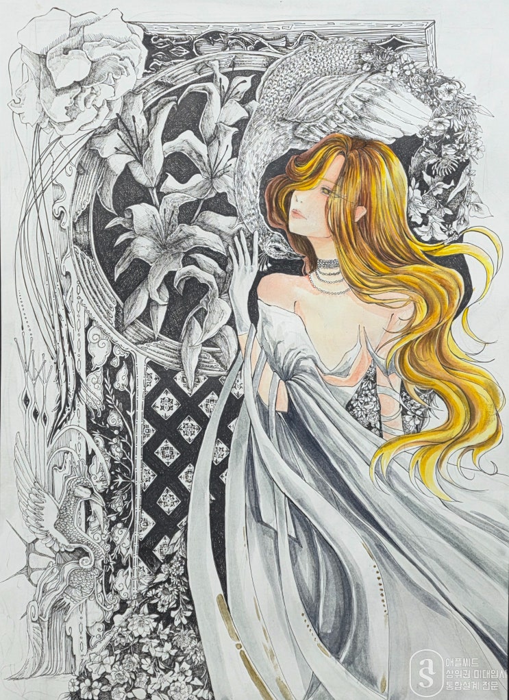 안녕하세요, 애플씨드의 문샘입니다. 요즘 중학생 창작반 학생들의 작업 몰입도가 점점 깊어지고 있습니다. 학생들은 펜과 물감 두 가지 재료를 사용해 아르누보 스타일의 작품을 작업하고 있는데 장식적인 요소가 많고 얇은 선들이 섬세하게 모여 하나의 화면을 완성하는 방식이라, 높은 집중력과 인내가 필요한 작업입니다. 처음에는 복잡하게 느껴지던 화면도 학생들이 한 선 한 선 차분히 채워 나가다 보면 점점 형태와 흐름이 살아나기 시작합니다. 그 과정 속에서 학생들은 어느새 작업에 깊이 빠져들고, 스스로도 몰랐던 집중력을 보여주곤 합니다. 애플씨드에서는 그림을 완성하는 결과만큼이나 이러한 ‘몰입의 경험’을 수업에서 매우....... <img src="https://blogthumb.pstatic.net/MjAyNjAzMTNfMjAz/MDAxNzczNDA1NDc3OTk0.Kqyo3fckDubvOnzKia97gLqsK8uNmbNSg0vLeE-GrQwg.L9zMvk7oAETpq8zCwJ0lxHPD3-SGzs1uHatBPHB-4Ocg.JPEG/98A3262D-557A-43C6-ADF9-5D9DF4642C98.jpeg?type=s3" />