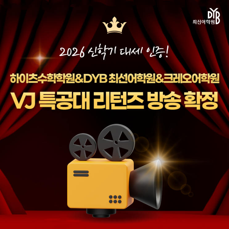 안녕하세요 DYB최선어학원 마포캠퍼스입니다. 2026년도 신학기 개강으로 한창 바쁜 시간을 보내고 있는 CREO(크레오)와 DYB 최선어학원 마포 캠퍼스에 정말 특별한 손님이 찾아오셨습니다! 바로 TV 방송 촬영을 위해 제작진분들이 방문해 주셨는데요. 바로, VJ특공대 리턴즈 제작진분들이 DYB최선어학원 & 크레오를 촬영하기 위해 방문하셨습니다! 신학기 준비로 눈코 뜰 새 없이 바쁜 와중에도 우리 아이들의 열정적인 학습 현장을 담기 위해 모두가 한마음으로 촬영에 임했답니다. ✊ 크레오 어학원에 대해 궁금해하시는 분들을 위해 우리가 가진 독보적인 장점과 학습 목표, | 그리고 초등학교 1학년부터 체계적으로 학....... <img src="https://blogthumb.pstatic.net/MjAyNjAzMThfMjEg/MDAxNzczODE5NTU4MTY0.jy-OqqrfoO0PZi5SqCRNO-bgvg_wvz7vbQ3tmHw7mc4g.QkO755G_W2DKmLgenYfs-Nq109n80br7dDnn3vEIBGsg.PNG/%B8%B6%C6%F7_%BD%C5%BC%F6%B5%BF_%BF%B5%BE%EE%C7%D0%BF%F8-001_%283%29.png?type=s3" />