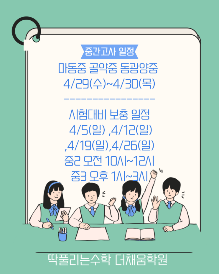 다시 돌아온 중간고사 시험대비 보충 중1은 1학기 시험이 없는 관계로 중2. 중3들만 보충을 합니다!!! #골약중 #동광양중 #마동중 #딱풀리는수학더채움학원 #중마동수학학원 <img src="https://blogthumb.pstatic.net/MjAyNjAzMTFfMTY4/MDAxNzczMjA3ODgxNjQ3.d0whulwyEts9sSATrO3u3Po61foPEFqtP9duA8uRY1Ug.GKaIEk4dEPskMGRmoYyq_ejstyP6uzX-aYLWMtJGX84g.PNG/900%A3%DF1773207354573.png?type=s3" />