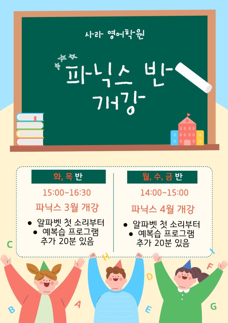 안녕하세요. 사라영어학원 원장 하은진 입니다. 미국 공교육도의 시작도 파닉스 라는것 알고 계셨나요? 영어를 제대로 배우기 위해선 음가와 규칙을 차분히 정리하고, 리딩에 들어가면 훨씬 더 정확하고 흔들림 없이 파닉스를 마무리 할 수 있습니다. 이번에도 개강을 하지 않으면 올해는 개강이 완전히 어려울 것 같아 재원생 동생들의 문의로 인해 파닉스 두개반을 어렵게 개강 합니다. 한 반은 3월에 이미 개강하여 두 번의 수업이 진행되었고, 또 다른 반은 4월에 새로 시작합니다. 수업은 월·수·금 오후 2시–3시, 주 3회 진행됩니다. ** 알파벳부터 (첫소리) 차근차근 배우는 단계입니다. 수업은 단계적으로 진행됩니다. 초기 단계에서는 알....... <img src="https://blogthumb.pstatic.net/MjAyNjAzMDZfMTY0/MDAxNzcyNzgyNzI4NjA1.L-406U6dEskueCnh7J6ankbuWfYF6parBHBe8XKrpoEg.s3gy-UpgMH_Tw3RIHeC05wv5aCxZA4cV6vYsiKpC3vAg.JPEG/%C6%C4%B4%D0%BD%BA%B9%DD%BE%C8%B3%BBjpg.jpg?type=s3" />