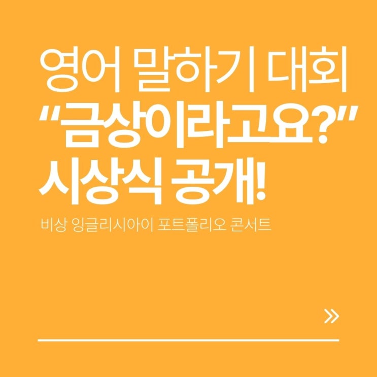 와아~ 진짜 제가 금상이에요? 1년에 한 번, 아이들의 실력과 성장을 한눈에 확인할 수 있는 시간! 비상 잉글리시아이 전국 영어 말하기 대회 포트폴리오 콘서트가 올해도 마무리되었어요. 지난 포스팅에서 금상 수상이라는 기쁜 소식을 먼저 전해드렸는데요. 오늘은 수상한 아이들의 예쁘고 멋진 모습을 살짝 공개할게요! 전국 1등, 금상 수상! 회원초 O인이 이번 포트폴리오 콘서트의 주인공 O인이! 평소에도 열심히 따라 말하기도 잘하고 이번 대회 준비 기간에도 하루하루 꾸준히 연습하며 완성해나갔어요. 우리 O인이의 발표 주제는 "라면을 맛있게 먹는 방법"이었는데요. 정말 귀엽고 생생한 표현으로, 자기만의 말하기를 멋지게....... <img src="https://blogthumb.pstatic.net/MjAyNjAzMTdfMjk5/MDAxNzczNjg0MjgzNzcz.ibKwmTvJUMrL7OCqonv8C2WOjNvlcmFuTRxOW7xG6Qgg.5GvP9L5MeCxJxYSZRuHf6gZz_VIOb6o0yOi05Vzd8o8g.JPEG/%C3%CA%B5%EE.jpg?type=s3" />
