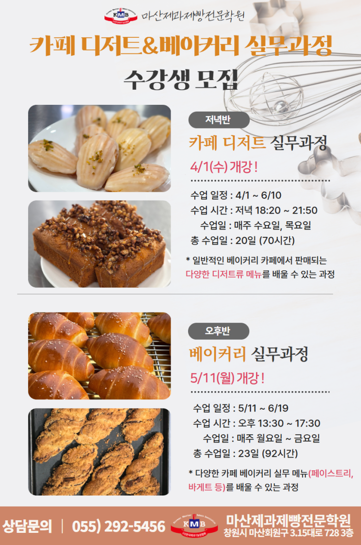 안녕하세요:) 마산제과제빵전문학원 입니다. 제과&제빵 실무과정인 [ 카페 디저트 과정 &베이커리 실무과정 ] 수업이 오픈했습니다. 자세한 일정은 사진 참고 부탁드립니다. 대상 : 일반생 및 국비생 중, 고 ,대학생 등 누구나 수강 가능합니다. < 수업소개 > ▶ 카페 디저트 실무과정 - 저녁반 수업 내용 : 일반적인 베이커리 카페에서 판매되는 다양한 디저트류 메뉴를 배울 수 있는 과정입니다. 휘낭시에, 타르트, 스콘, 마카롱 등이 포함되어 있습니다. ▶ 베이커리 실무과정 - 오후반 수업 내용 : 다양한 카페 베이커리 실무 메뉴들을 배울 수 있는 과정입니다. 페이스트리 류 제품(크루아상, 몽블랑), 바게트 류 제품(마늘 바....... <img src="https://blogthumb.pstatic.net/MjAyNjAzMThfMjIx/MDAxNzczODA5NzYxMDc4.d6sleukw0VrpQDZy4m-NCucnP02nieqFqaALwgthpGYg.ZQRSZgOedgqn05gwSM2tzNVSmbg2NoBQydHToSk8Dekg.PNG/%C3%A2%BF%F8%C1%A6%B0%FA%C1%A6%BB%A7%2C%B8%B6%BB%EA%C1%A6%B0%FA%C1%A6%BB%A7%C0%FC%B9%AE%C7%D0%BF%F8%2C%B8%B6%BB%EA%C1%A6%B0%FA%C1%A6%BB%A7%C7%D0%BF%F8%2C%B1%B9%BA%F1%C1%A6%B0%FA%C1%A6%BB%A7%2C%B8%B6%BB%EA%BF%F8%B5%A5%C0%CC%2C%C3%A2%BF%F8%BF%F8%B5%A5%C0%CC%2C%C3%A2%BF%F8%BA%A3%C0%CC%C5%B7%2C%B8%B6%BB%EA%BA%A3%C0%CC%C5%B7%2C%B1%E8%C7%D8%C1%A6%B0%FA%C1%A6%BB%A7%C7%D0%BF%F8%2C%B1%E8%C7%D8%C1%A6%B0%FA%C1%A6%BB%A7%2C%C3%A2%BF%F8.png?type=s3" />
